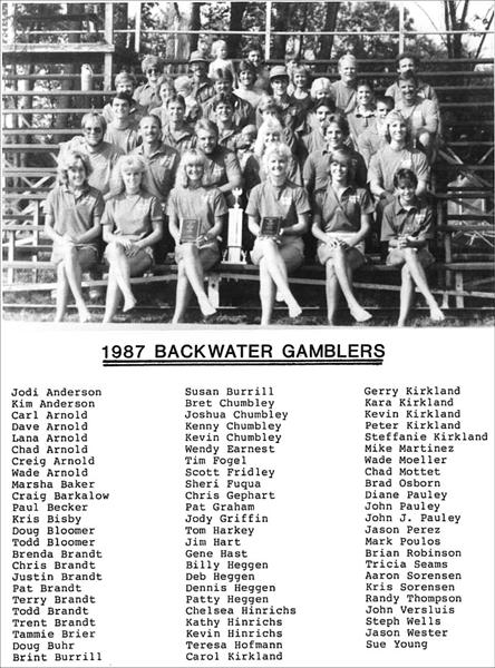 We finished sixth at Nationals. Accomplishments included a ten female slalom ballet line, a five female swivel line and our first successful competition barefoot pyramid. The show was called "Gilligan's' Island."