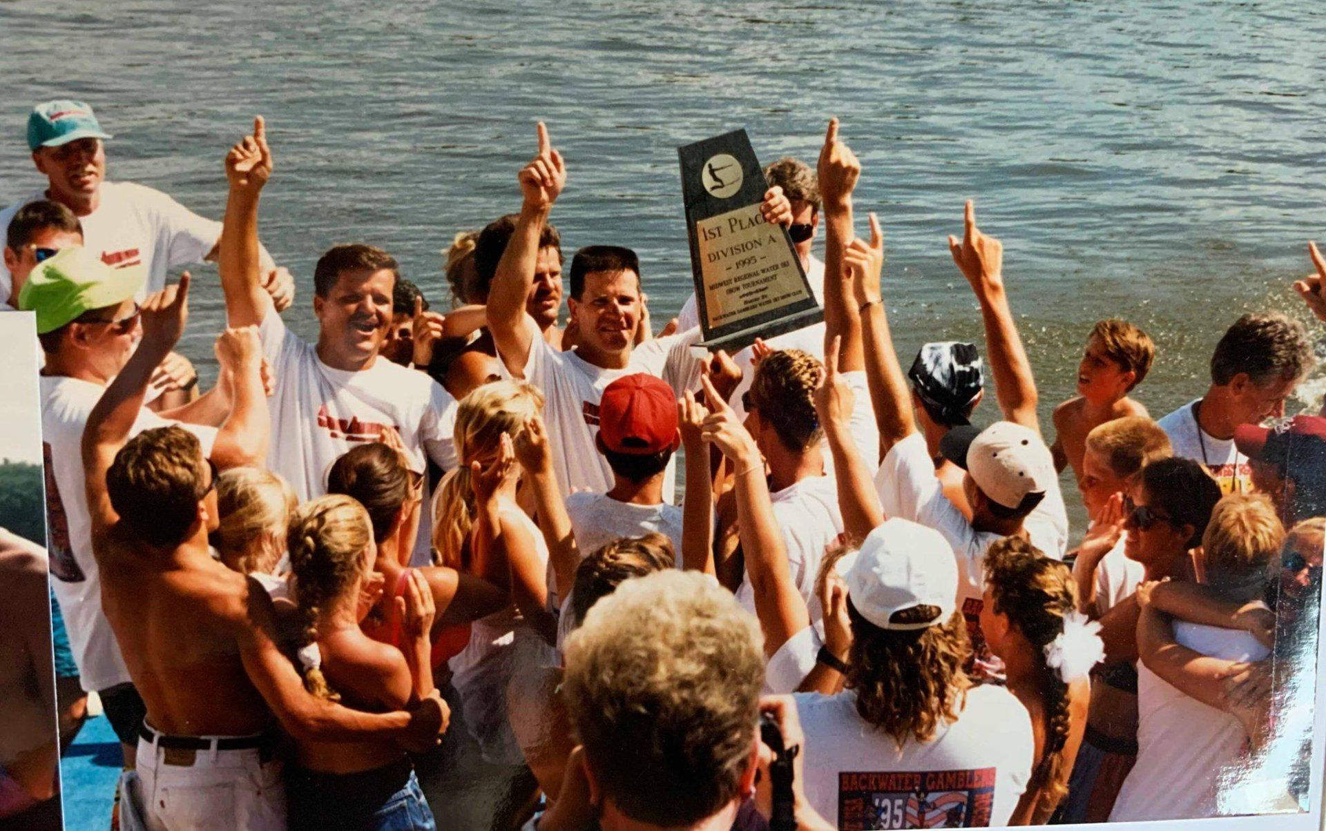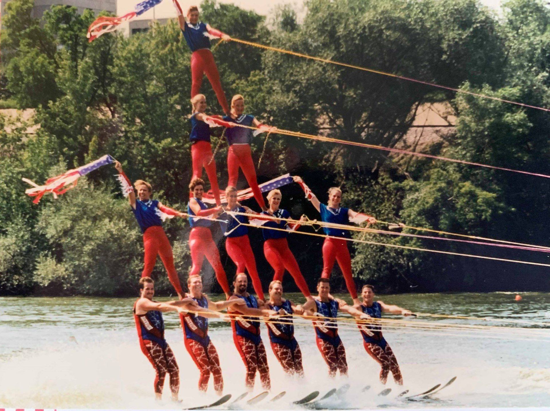 With our theme Rockin' in the U.S.A., we rocked Libertyville at the Lambs' Farm Tournament winning second place, missing first by 2 points out of 2100. We won first place at the Midwest Regional Show Ski Tournament, hosted by us at our site. We had the highest scoring ballet line, barefoot act, jump act and overall tournament act. We also won the best announcing, dock and equipment crew, pickup boat crew and tow boat. We climbed back to the top at the Nationals with a fourth place finish and received prime national television coverage on ESPN. The Backwater Gamblers became the Organization of the Year in the City of Rock Island. The show was called "Rockin' in the USA". The Show Director was Scott Allender.