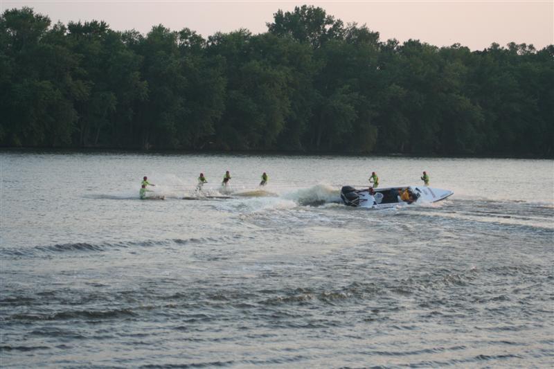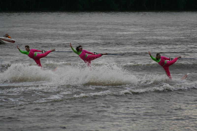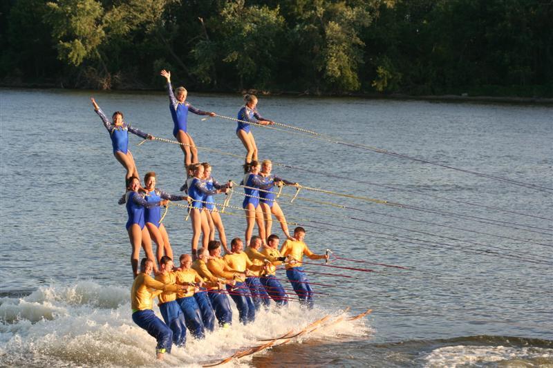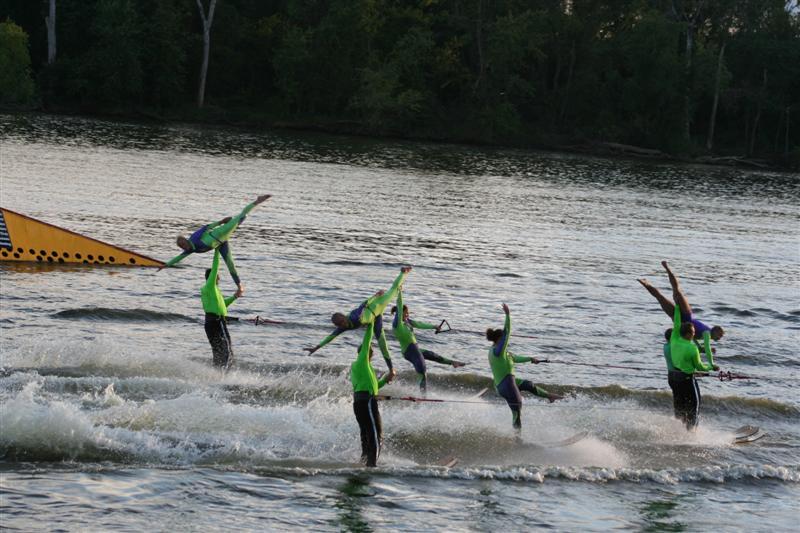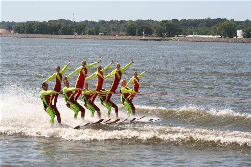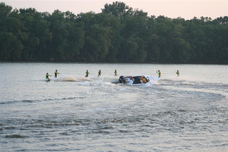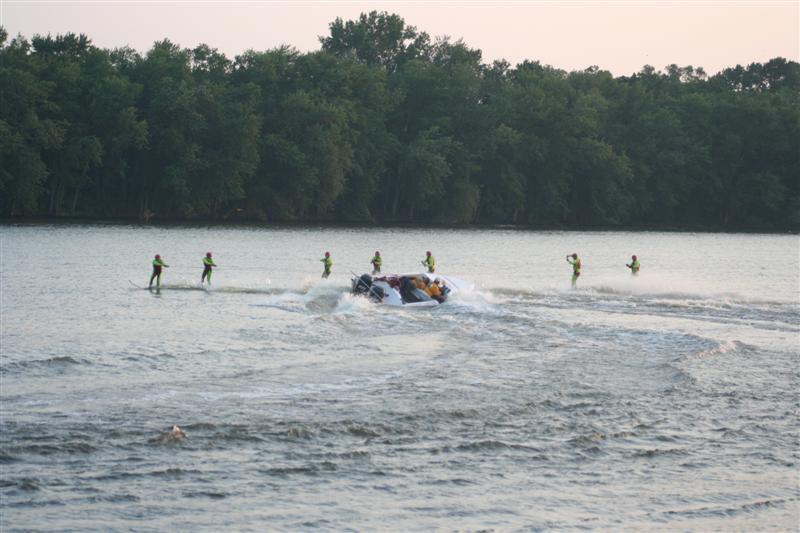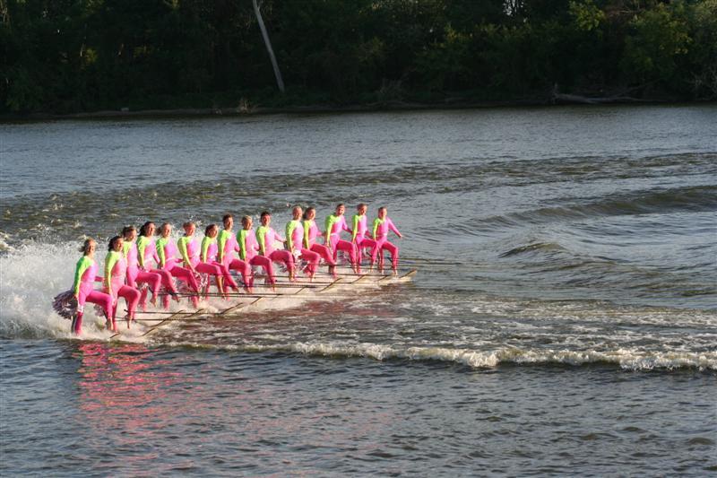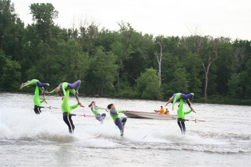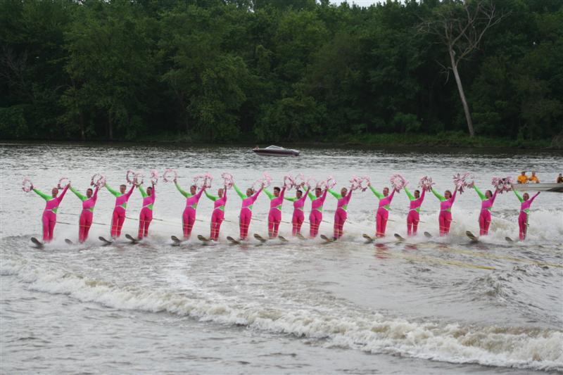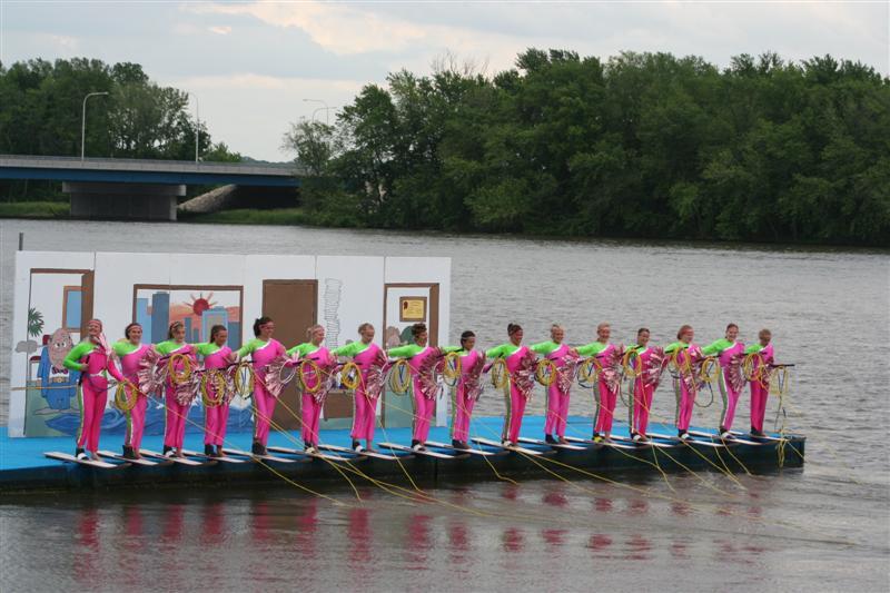 2008 began with a flood. We didn't get on the water for the most of June and then were flooded again for part of July. The first tournament that we were scheduled to attend was the Mercury Invitational Tournament in Janesville Wisconsin. Due to the flooding, this tournament was canceled. We place 2nd at the Central Region Tournament held in Warsaw, Indiana. We were scheduled to host the Division II National Tournament. Because of the flooding on the Rock River, this tournament was moved to Indiana. The National Tournament was suppose to be held in Janesville, Wisconsin, but floods forced the tournament to move to Wisconsin Rapids. We skied first on Sunday morning in 42 degree weather. We did remarkably well for the limited skiing that we had all season. We brought home an 8th place victory. "Corporate Merger" was the name of this year's theme. Brint and Gail Burrill were the Show Directors.