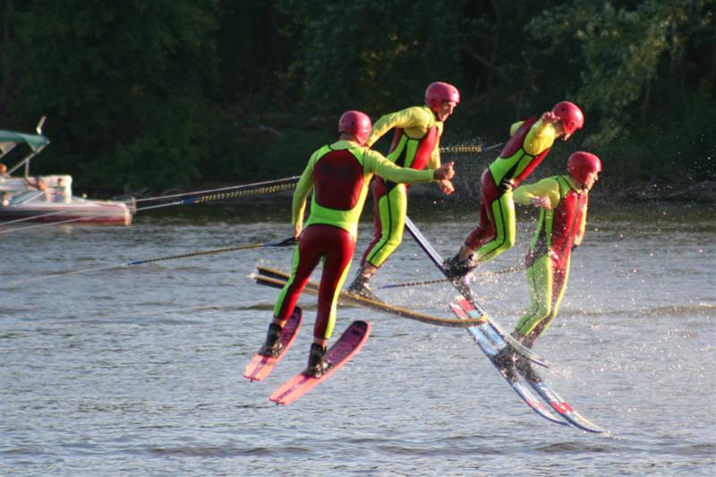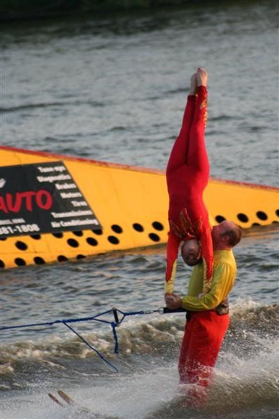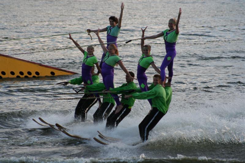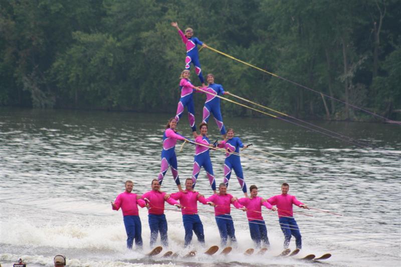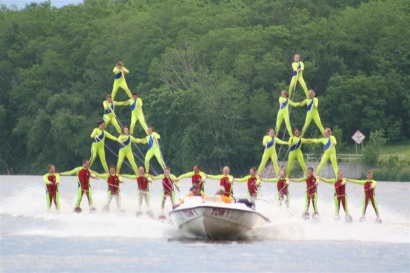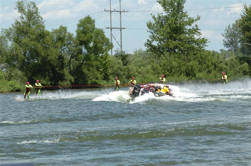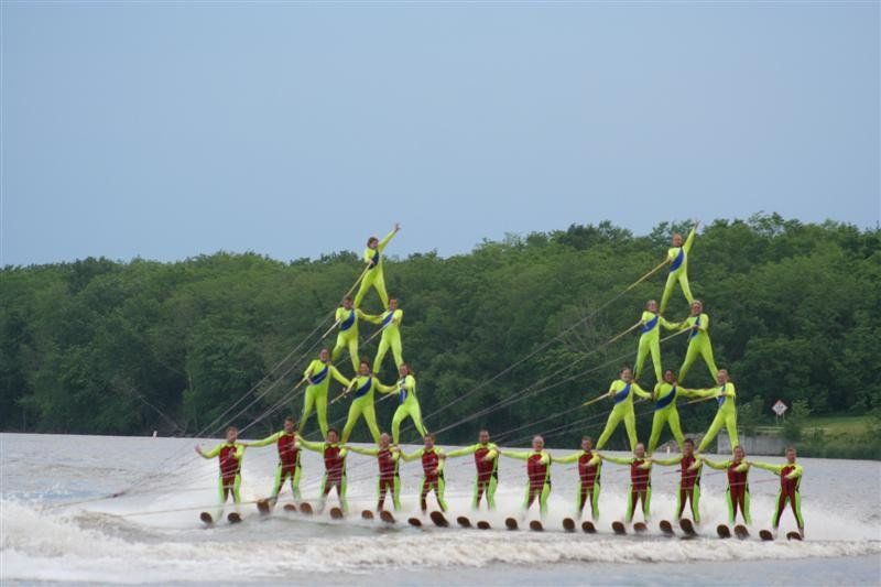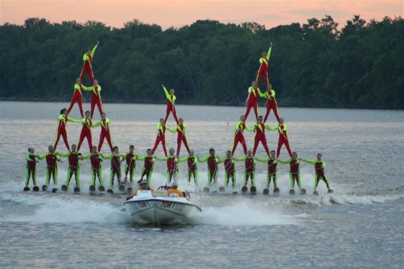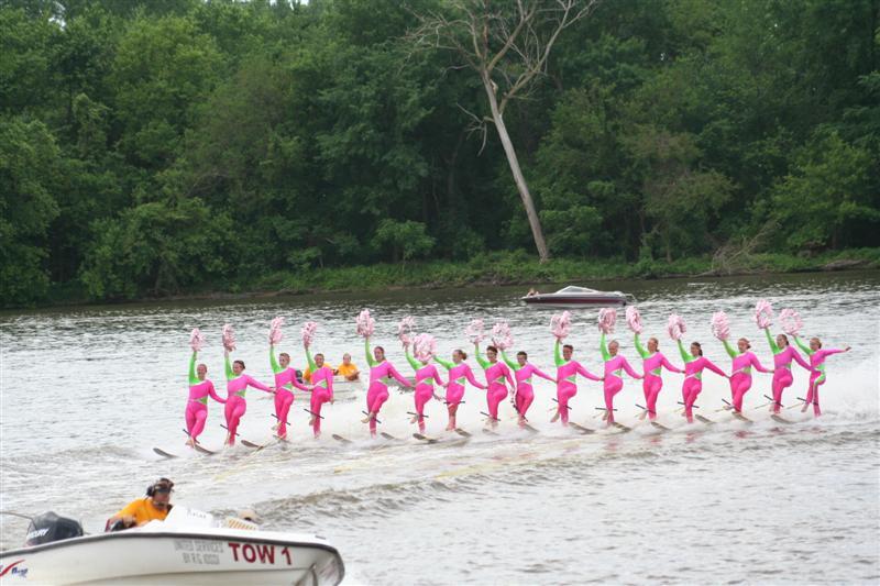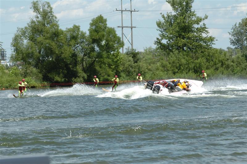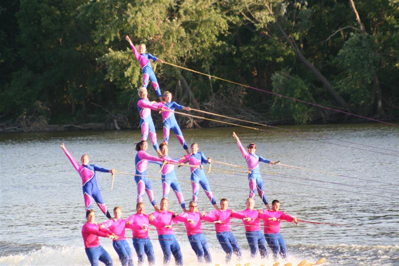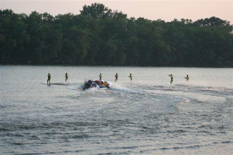 2008 began with a flood. We didn't get on the water for the most of June and then were flooded again for part of July. The first tournament that we were scheduled to attend was the Mercury Invitational Tournament in Janesville Wisconsin. Due to the flooding, this tournament was canceled. We place 2nd at the Central Region Tournament held in Warsaw, Indiana. We were scheduled to host the Division II National Tournament. Because of the flooding on the Rock River, this tournament was moved to Indiana. The National Tournament was suppose to be held in Janesville, Wisconsin, but floods forced the tournament to move to Wisconsin Rapids. We skied first on Sunday morning in 42 degree weather. We did remarkably well for the limited skiing that we had all season. We brought home an 8th place victory. "Corporate Merger" was the name of this year's theme. Brint and Gail Burrill were the Show Directors.