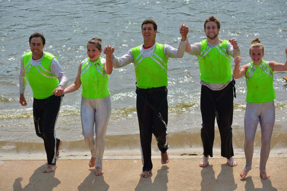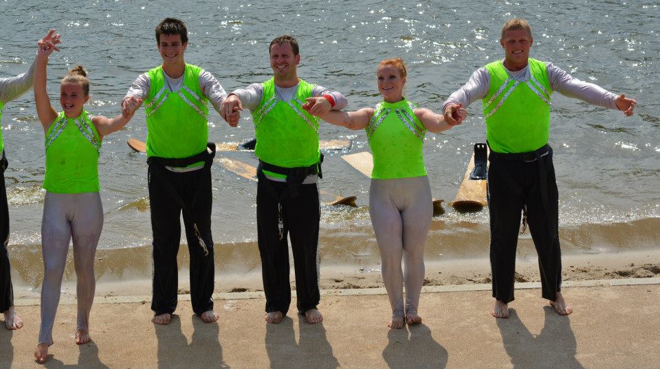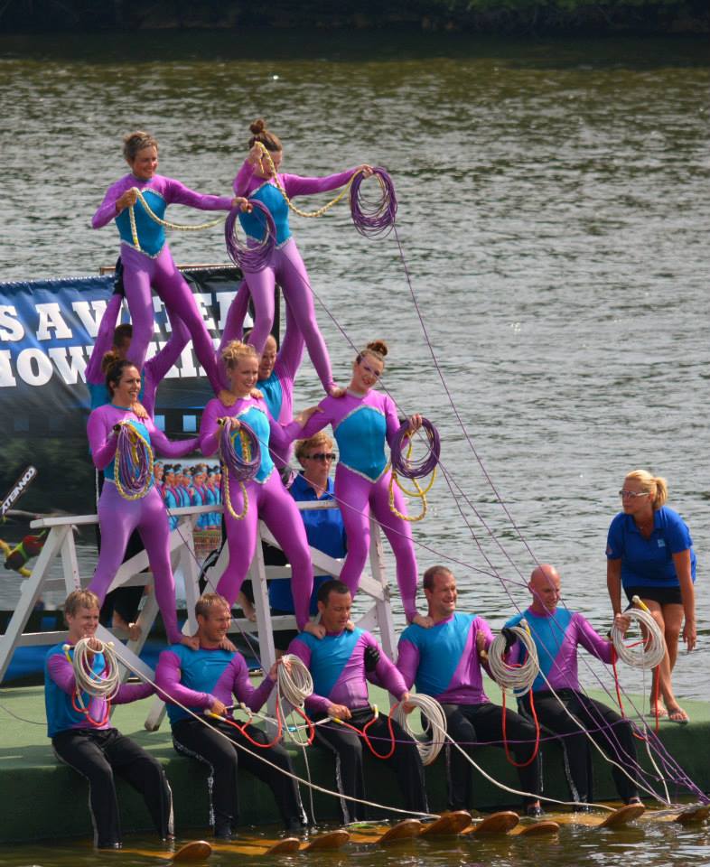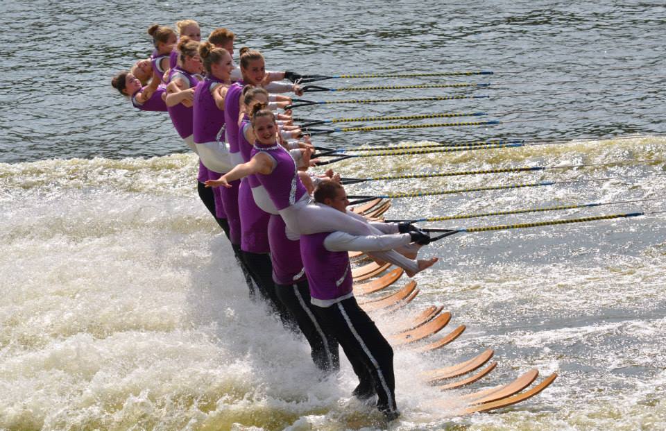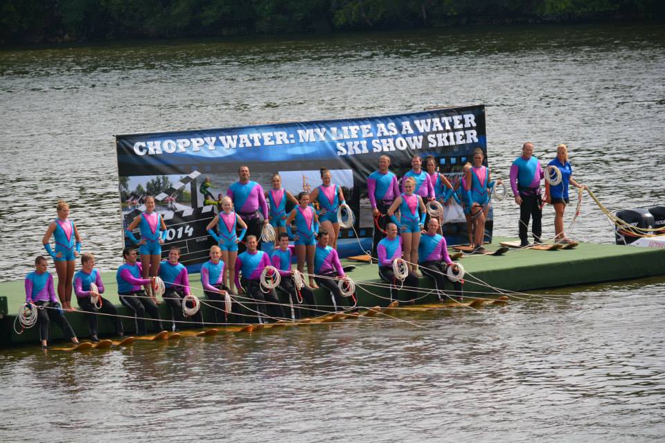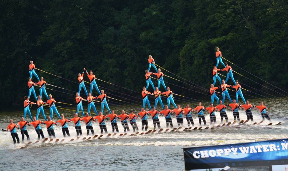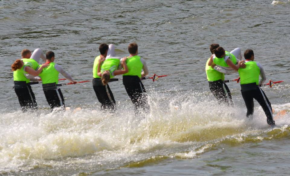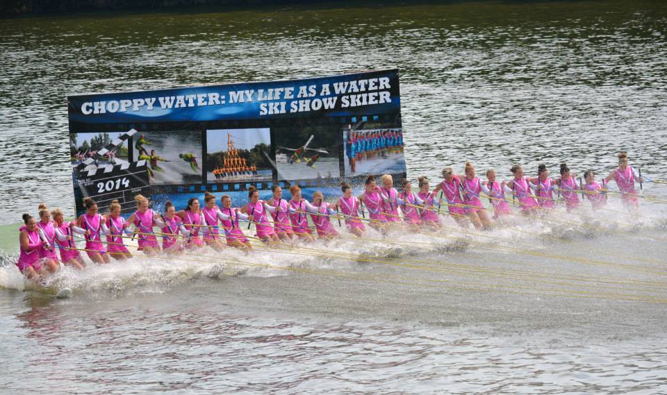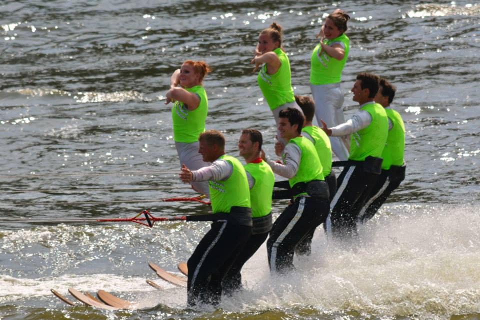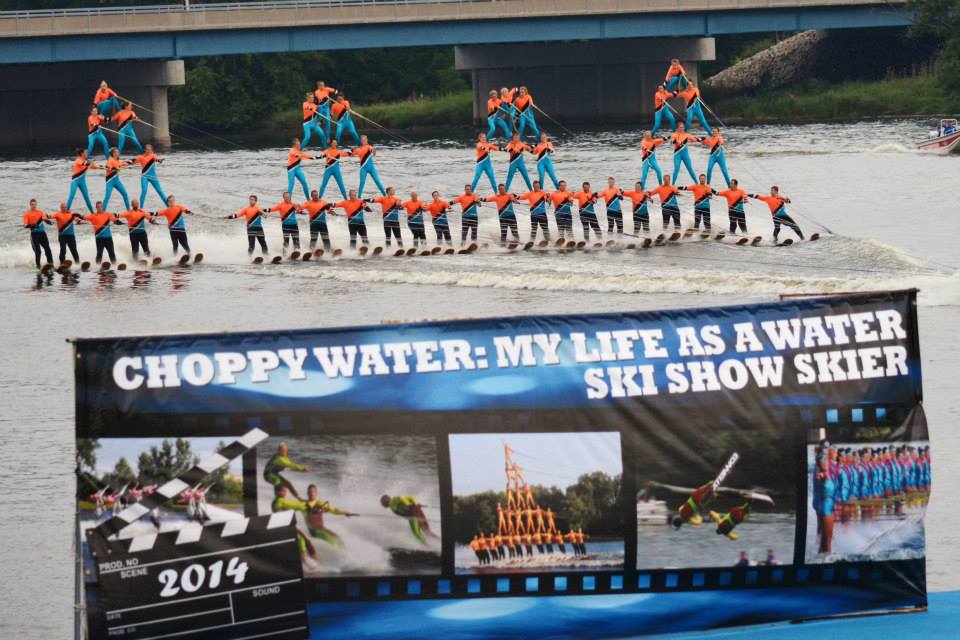 2014 boasted our most succesful season ever! Our team grew to over 160 members, the largest in history. We placed 3rd at the Mercury Open in June and, after flooding halted our practices and shows for two weeks, placed 2nd at the Central Regional tournament. We successfully built our largest pyramid ever with 47 people building four 4 tiers all behind one boat. We are only one of two teams to have ever built a pyramid that large, and we successfully climbed it up twice, and once also brought it all back down and into the beach, a feat that no other team in show skiing has ever done. We placed second place at the National Tournament in Janesville, Wisconsin, our best placement ever! We had more rides in our National show than any other team ever. We also won the award for highest scoring pyramid for our four 4 tier pyramid (of which we had 2 skiers fall). The theme was 'Choppy Water: My Life as a Water Ski Show Skier'. The show directors were Scott Allender and Tagen Tipton.