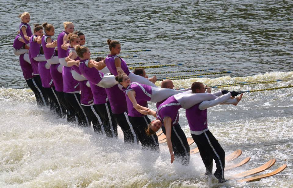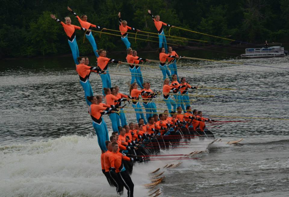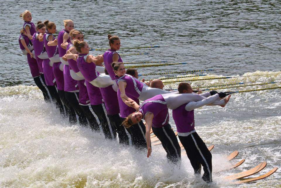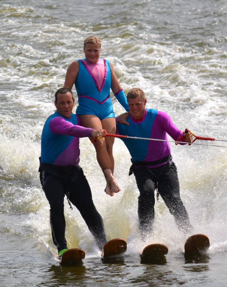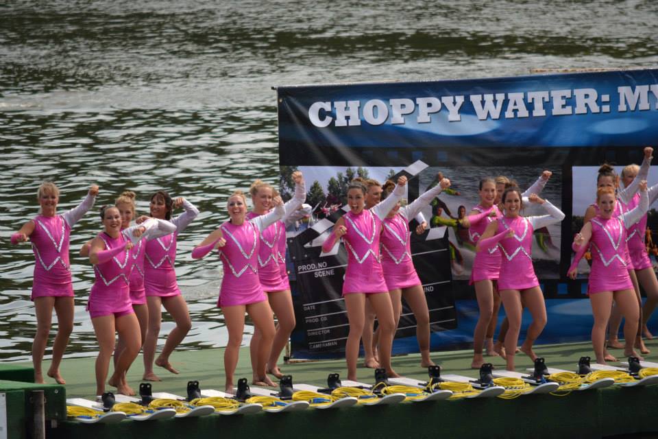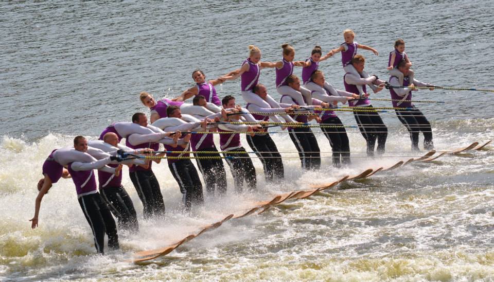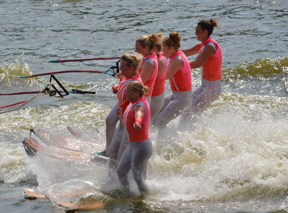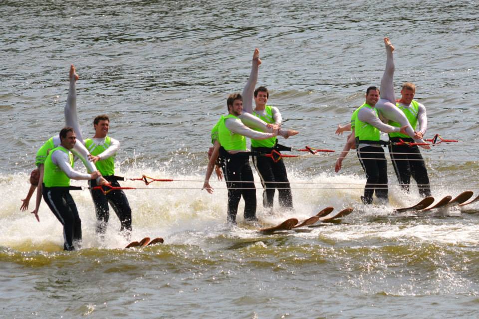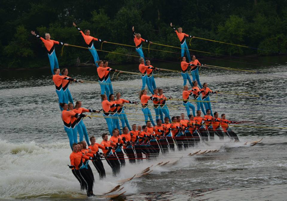 2014 boasted our most succesful season ever! Our team grew to over 160 members, the largest in history. We placed 3rd at the Mercury Open in June and, after flooding halted our practices and shows for two weeks, placed 2nd at the Central Regional tournament. We successfully built our largest pyramid ever with 47 people building four 4 tiers all behind one boat. We are only one of two teams to have ever built a pyramid that large, and we successfully climbed it up twice, and once also brought it all back down and into the beach, a feat that no other team in show skiing has ever done. We placed second place at the National Tournament in Janesville, Wisconsin, our best placement ever! We had more rides in our National show than any other team ever. We also won the award for highest scoring pyramid for our four 4 tier pyramid (of which we had 2 skiers fall). The theme was 'Choppy Water: My Life as a Water Ski Show Skier'. The show directors were Scott Allender and Tagen Tipton.
