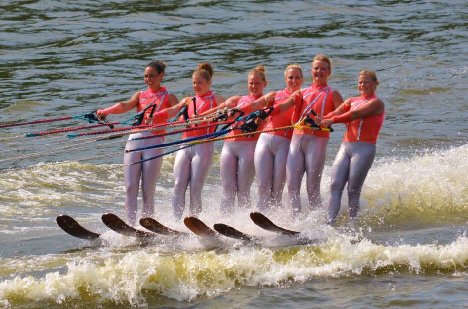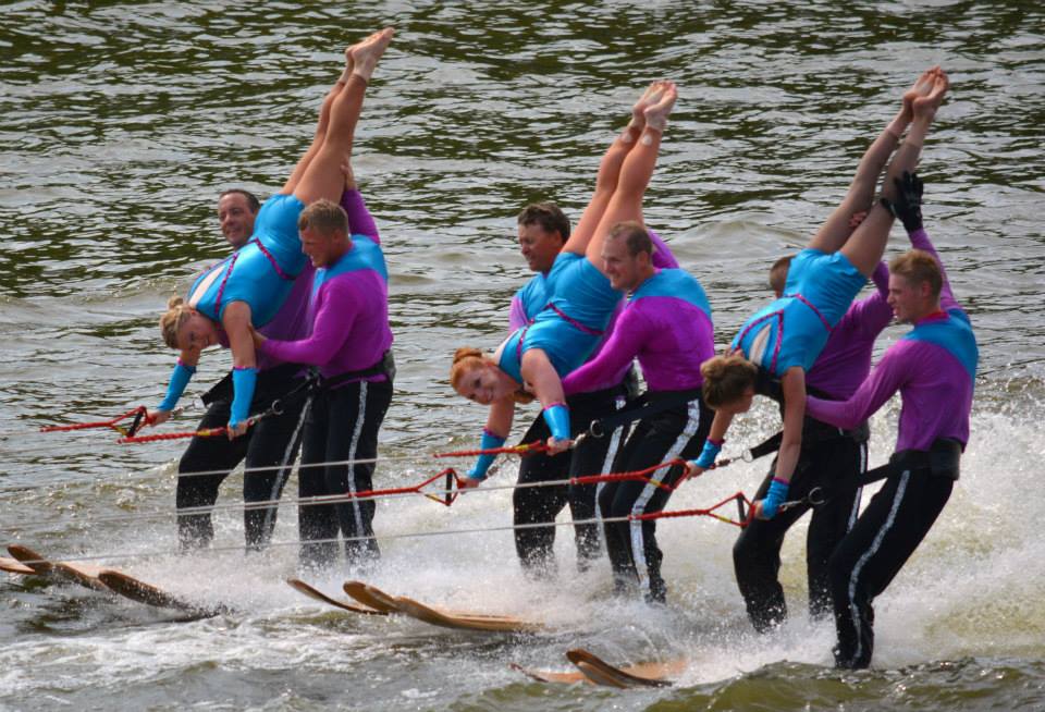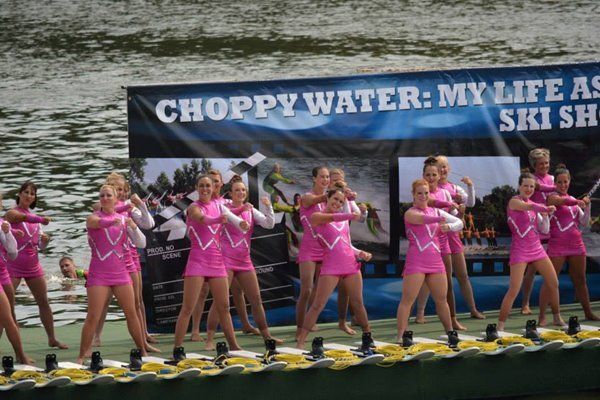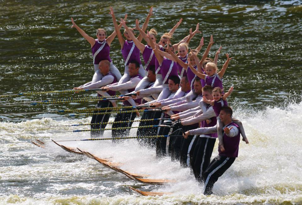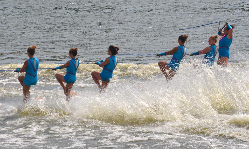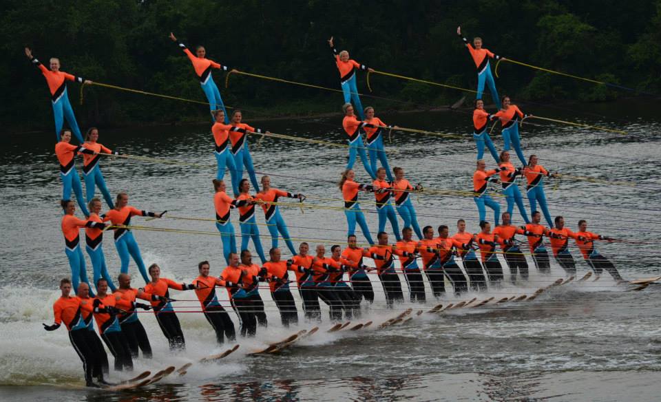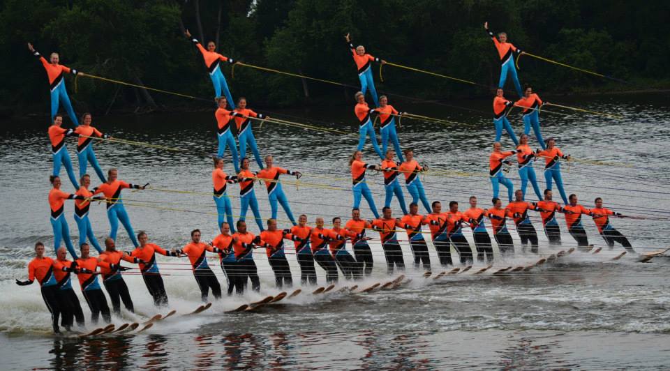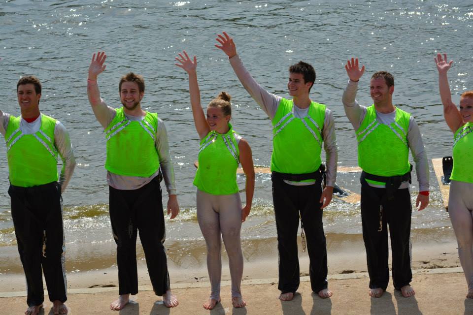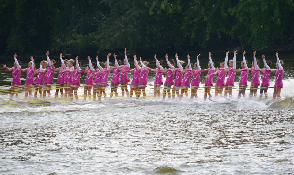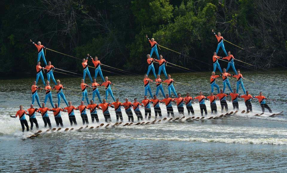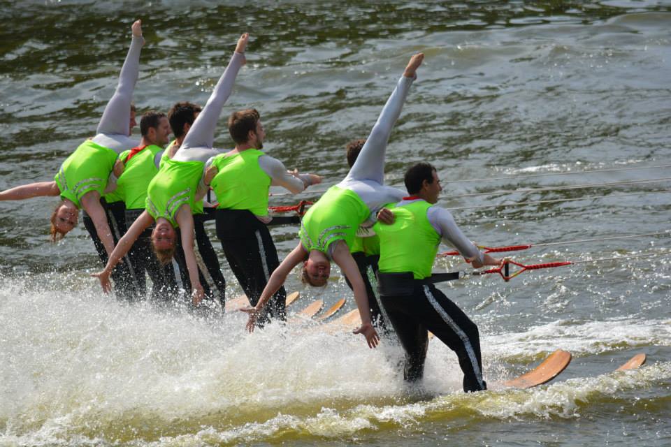 2014 boasted our most succesful season ever! Our team grew to over 160 members, the largest in history. We placed 3rd at the Mercury Open in June and, after flooding halted our practices and shows for two weeks, placed 2nd at the Central Regional tournament. We successfully built our largest pyramid ever with 47 people building four 4 tiers all behind one boat. We are only one of two teams to have ever built a pyramid that large, and we successfully climbed it up twice, and once also brought it all back down and into the beach, a feat that no other team in show skiing has ever done. We placed second place at the National Tournament in Janesville, Wisconsin, our best placement ever! We had more rides in our National show than any other team ever. We also won the award for highest scoring pyramid for our four 4 tier pyramid (of which we had 2 skiers fall). The theme was 'Choppy Water: My Life as a Water Ski Show Skier'. The show directors were Scott Allender and Tagen Tipton.
