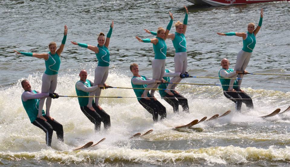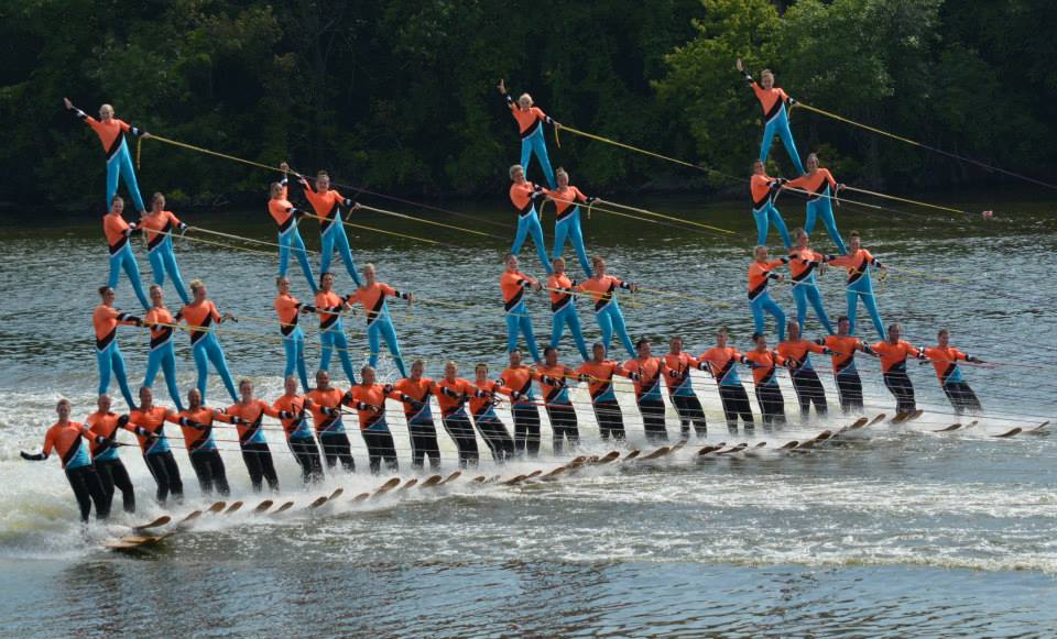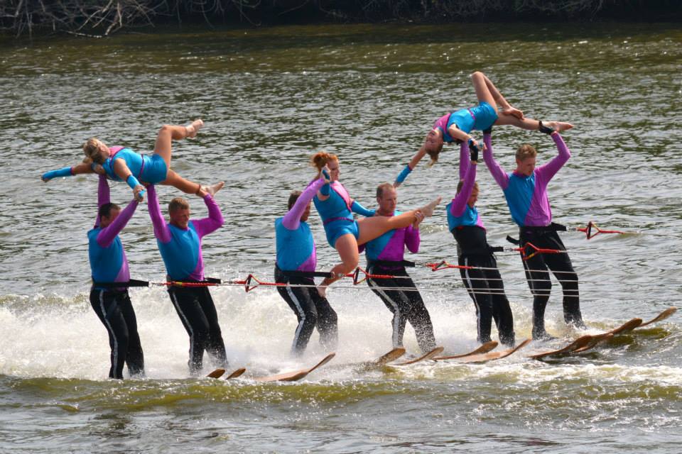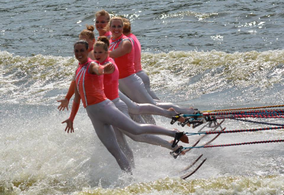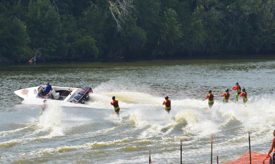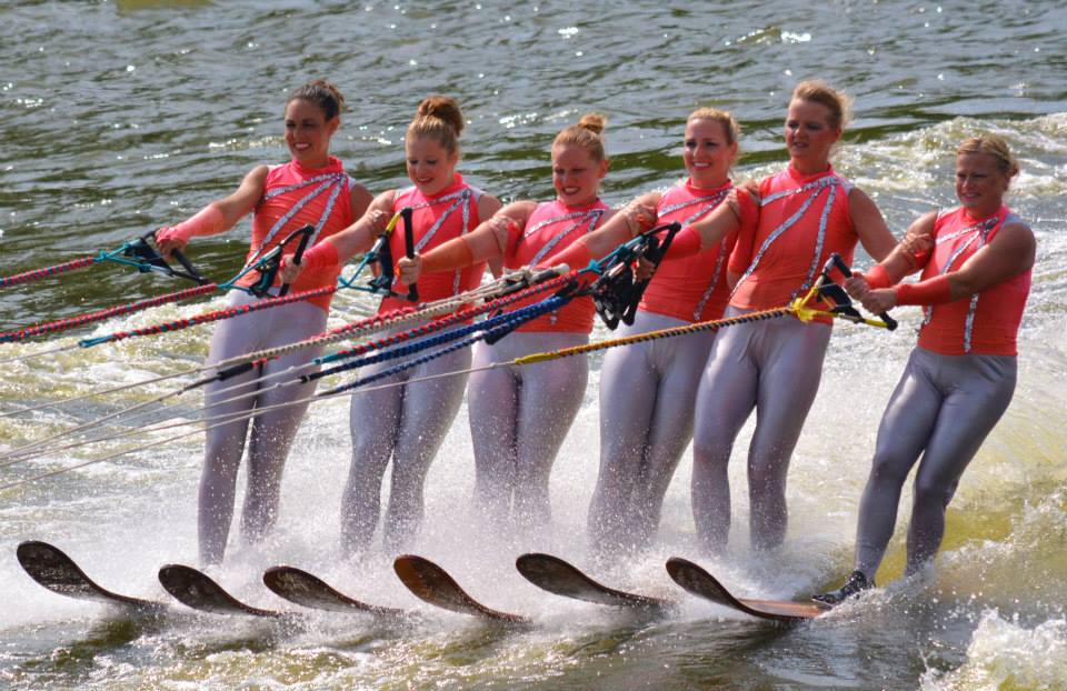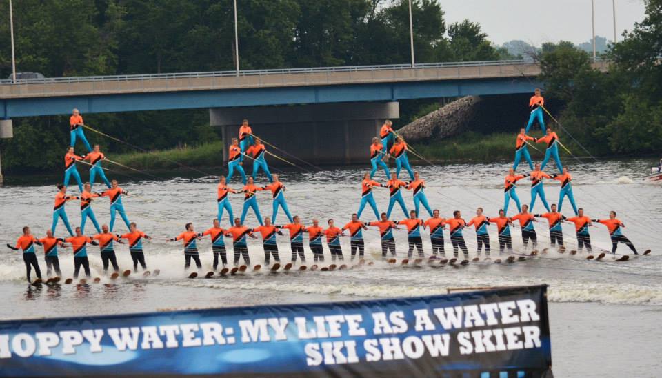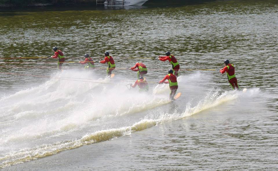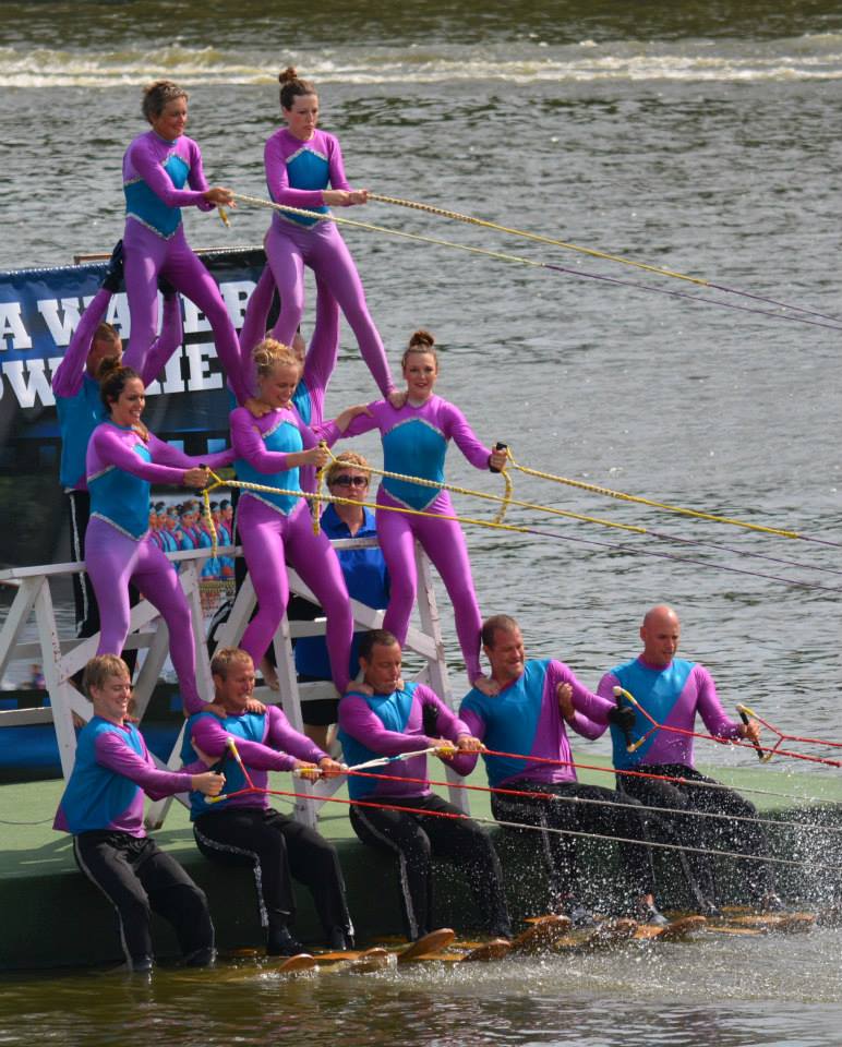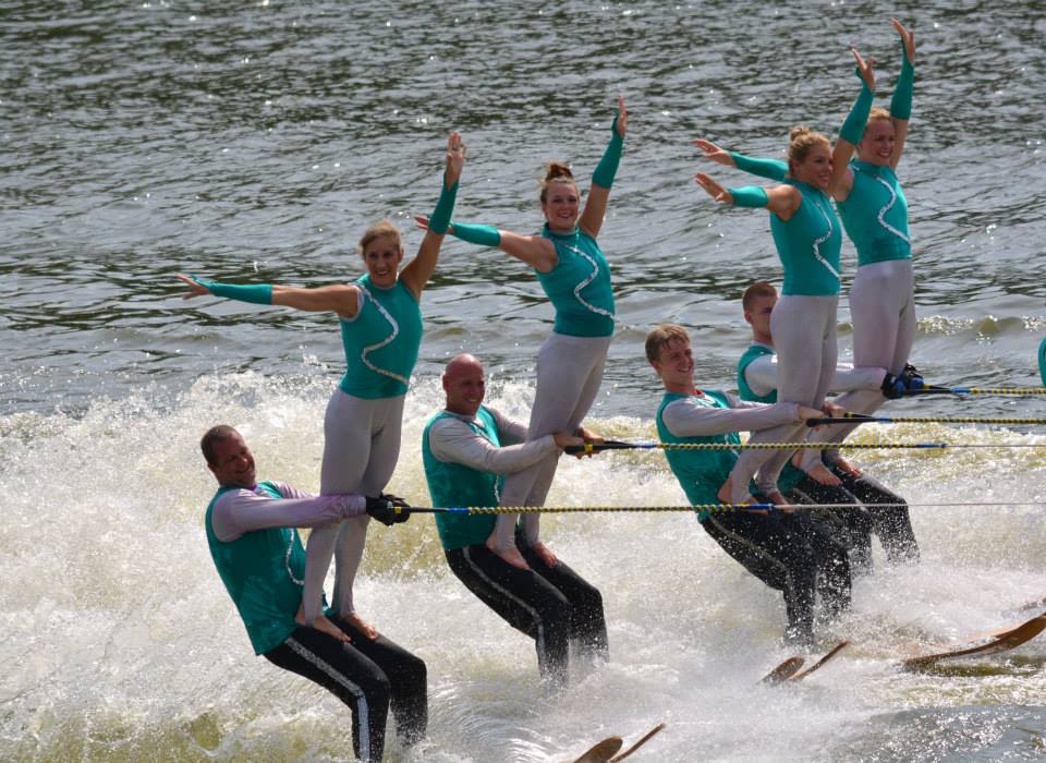 2014 boasted our most succesful season ever! Our team grew to over 160 members, the largest in history. We placed 3rd at the Mercury Open in June and, after flooding halted our practices and shows for two weeks, placed 2nd at the Central Regional tournament. We successfully built our largest pyramid ever with 47 people building four 4 tiers all behind one boat. We are only one of two teams to have ever built a pyramid that large, and we successfully climbed it up twice, and once also brought it all back down and into the beach, a feat that no other team in show skiing has ever done. We placed second place at the National Tournament in Janesville, Wisconsin, our best placement ever! We had more rides in our National show than any other team ever. We also won the award for highest scoring pyramid for our four 4 tier pyramid (of which we had 2 skiers fall). The theme was 'Choppy Water: My Life as a Water Ski Show Skier'. The show directors were Scott Allender and Tagen Tipton.