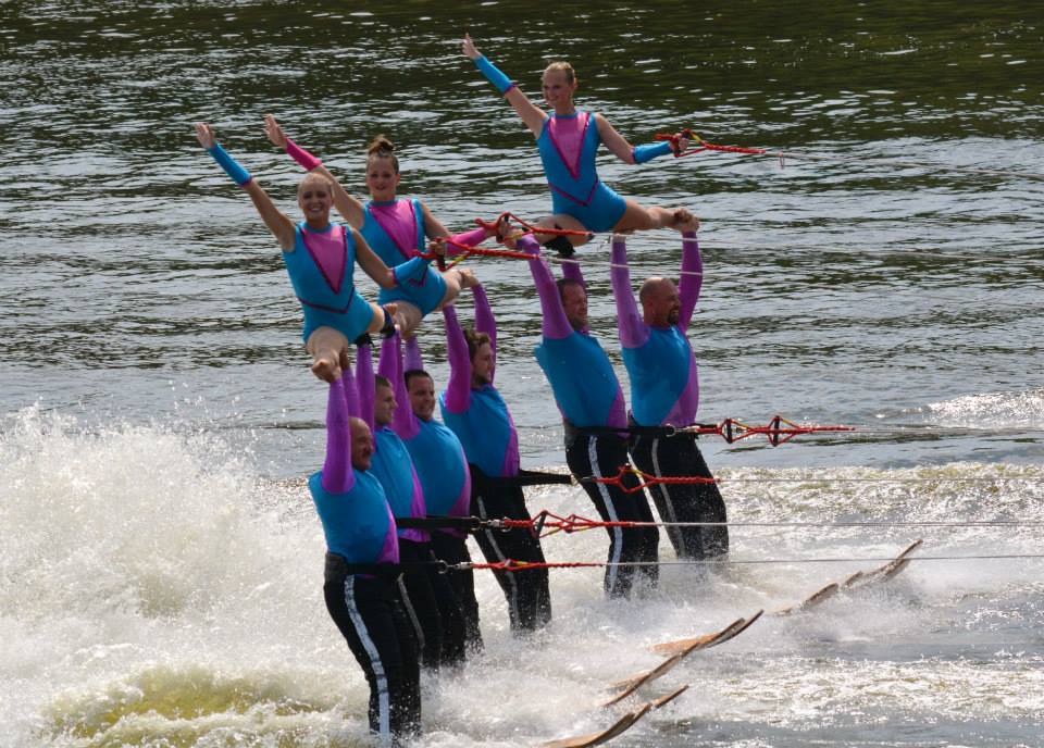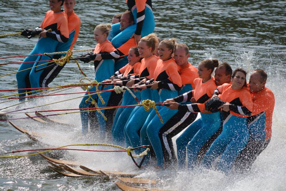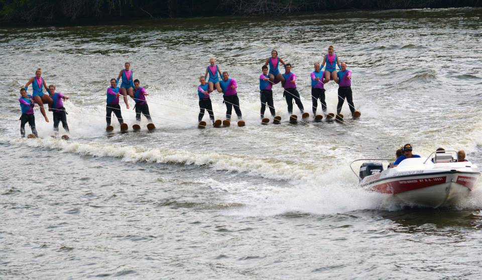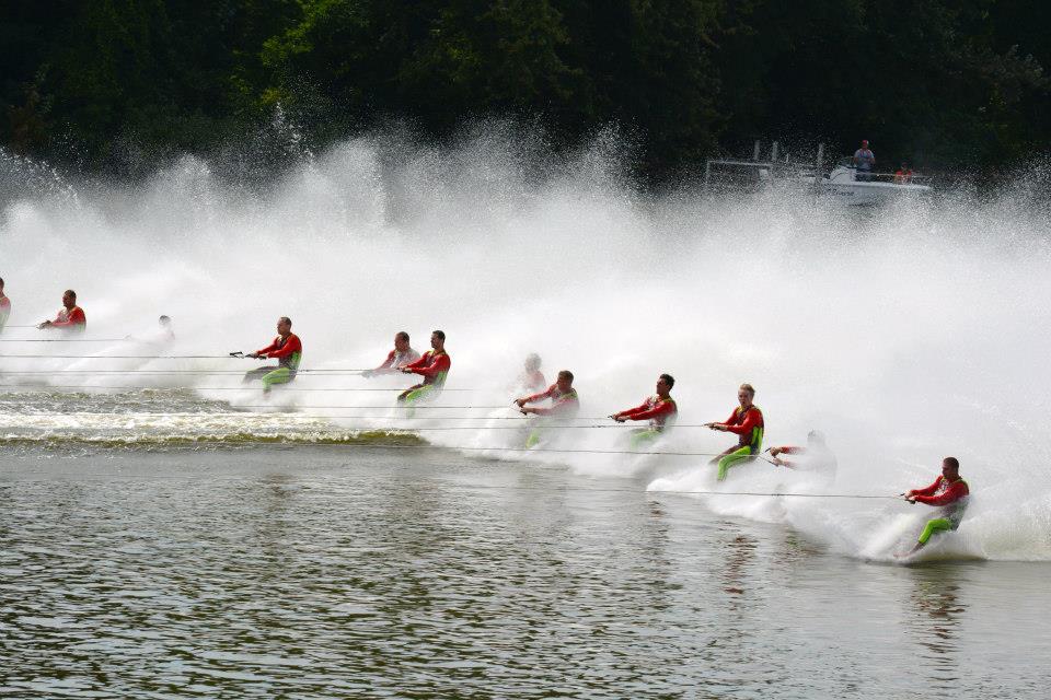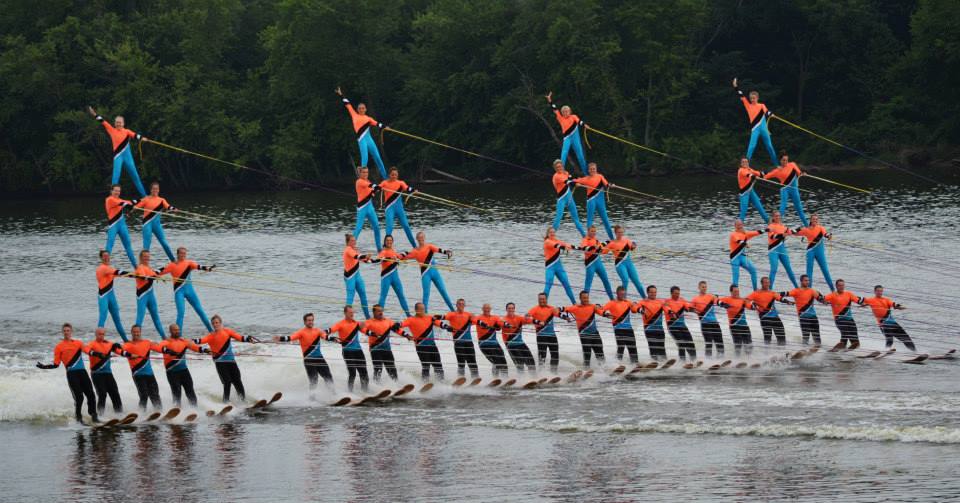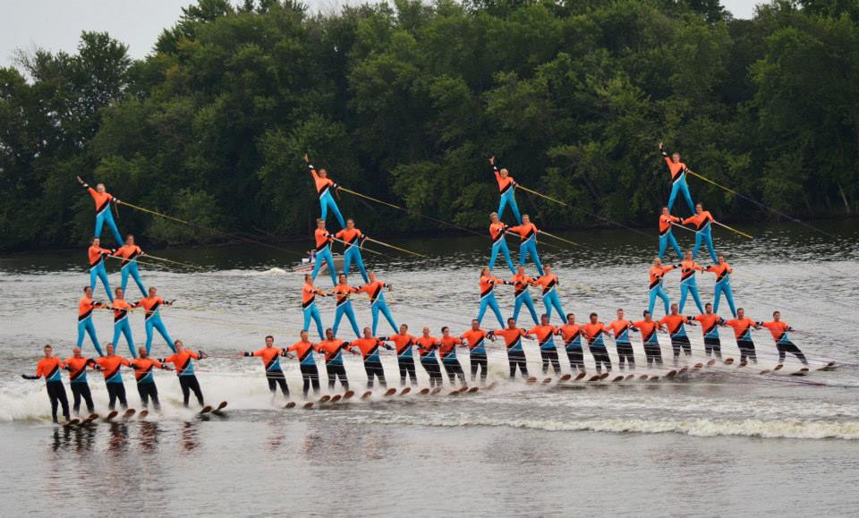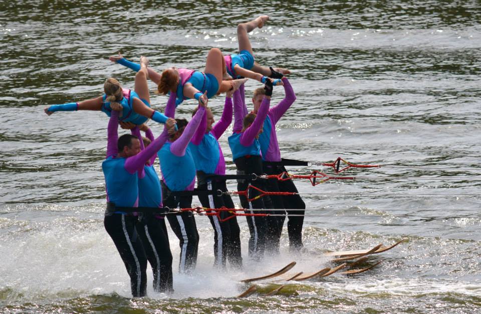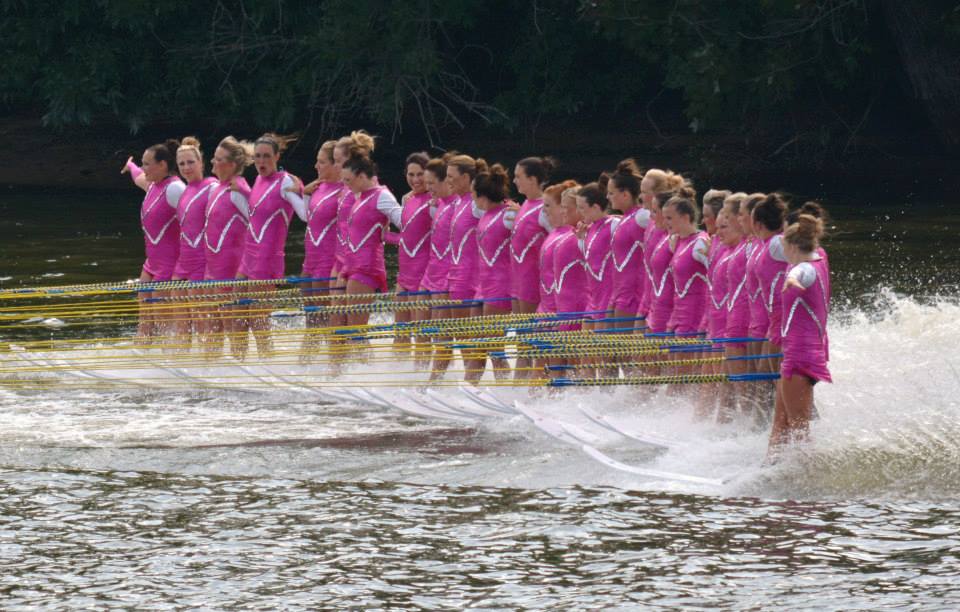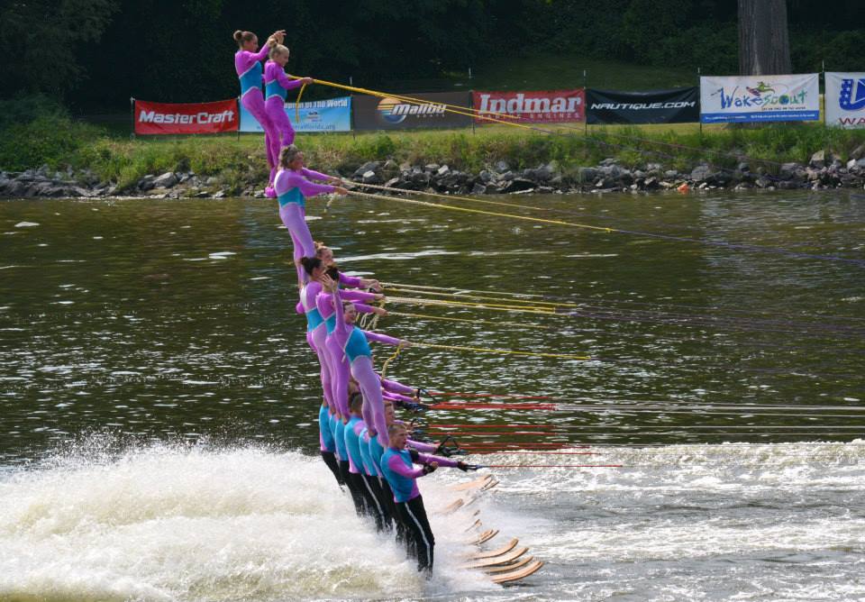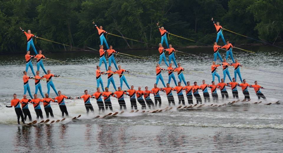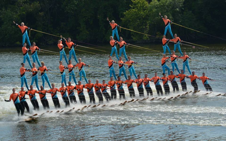 2014 boasted our most succesful season ever! Our team grew to over 160 members, the largest in history. We placed 3rd at the Mercury Open in June and, after flooding halted our practices and shows for two weeks, placed 2nd at the Central Regional tournament. We successfully built our largest pyramid ever with 47 people building four 4 tiers all behind one boat. We are only one of two teams to have ever built a pyramid that large, and we successfully climbed it up twice, and once also brought it all back down and into the beach, a feat that no other team in show skiing has ever done. We placed second place at the National Tournament in Janesville, Wisconsin, our best placement ever! We had more rides in our National show than any other team ever. We also won the award for highest scoring pyramid for our four 4 tier pyramid (of which we had 2 skiers fall). The theme was 'Choppy Water: My Life as a Water Ski Show Skier'. The show directors were Scott Allender and Tagen Tipton.