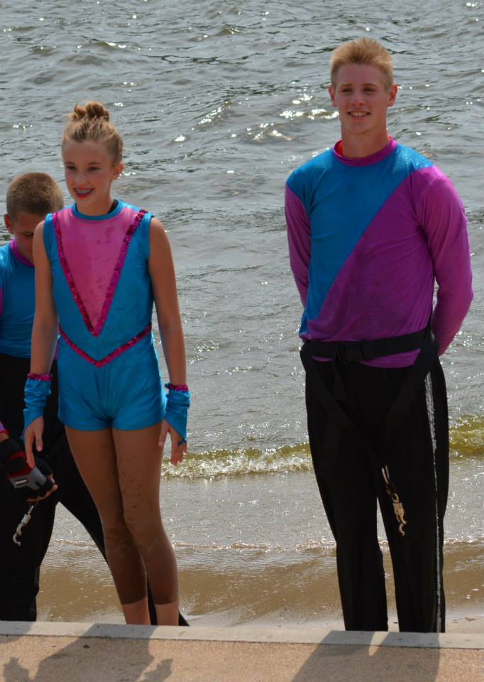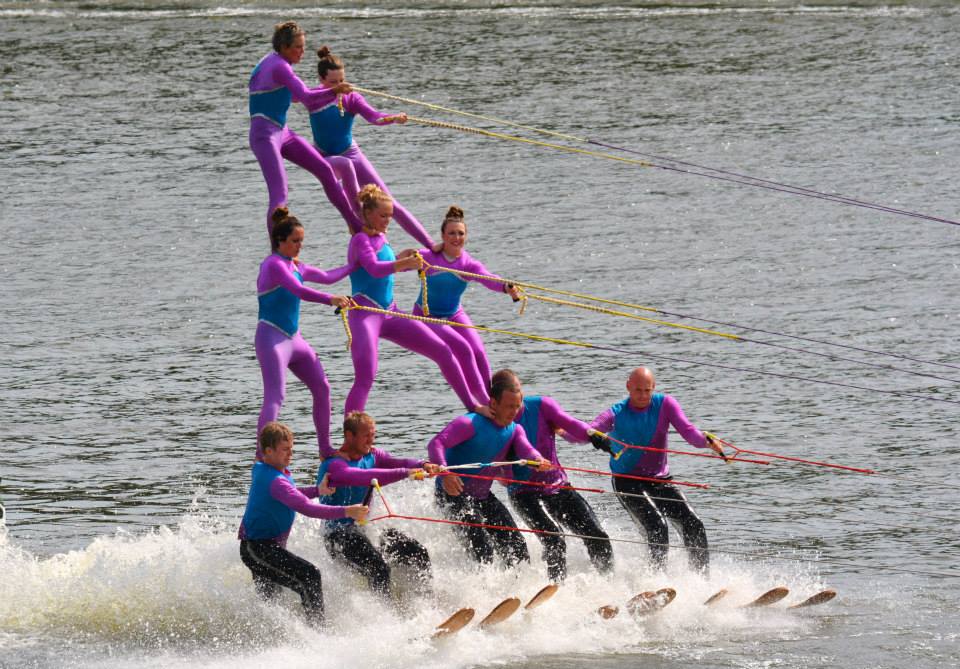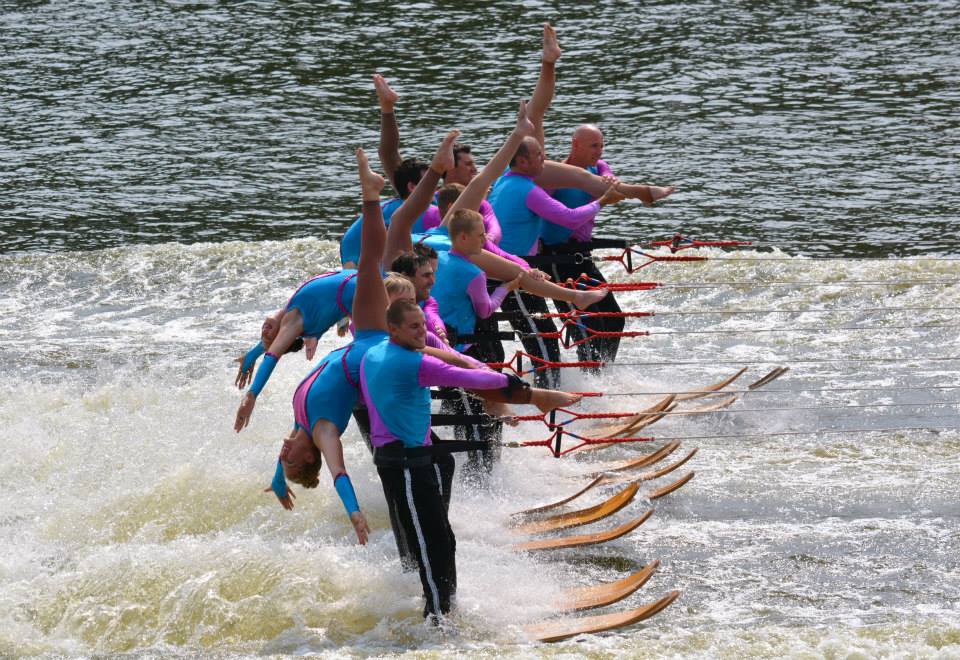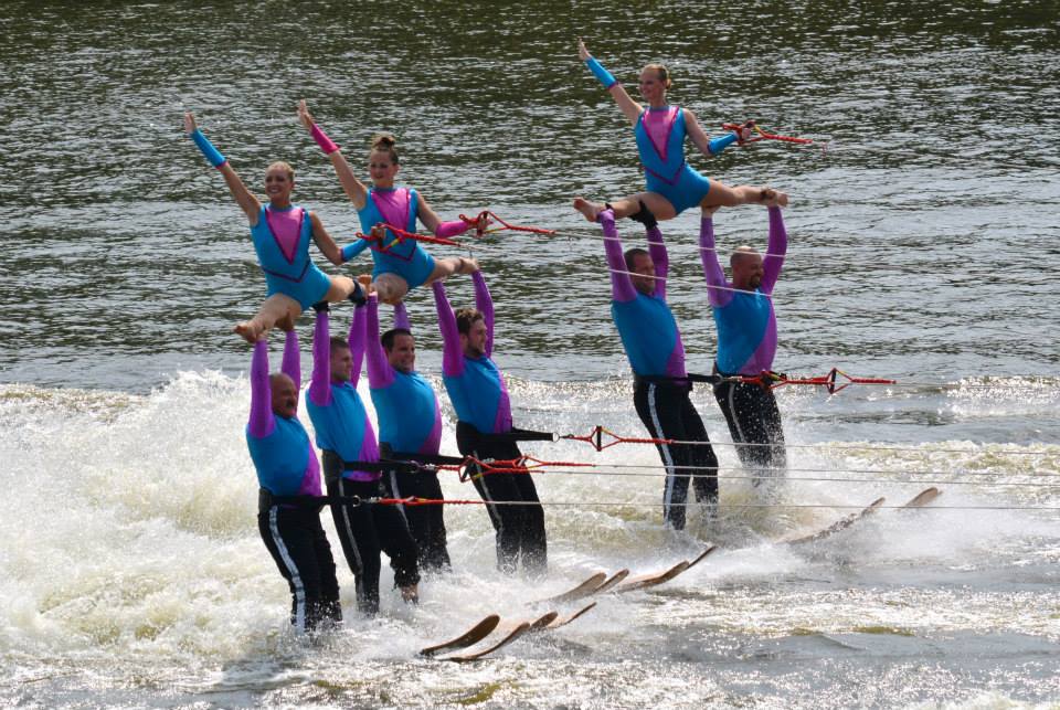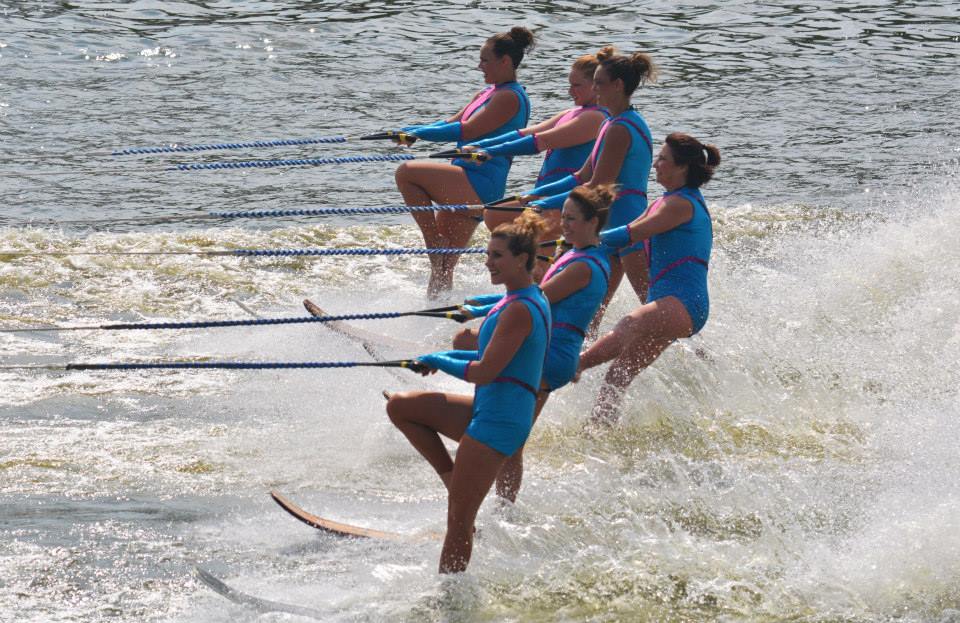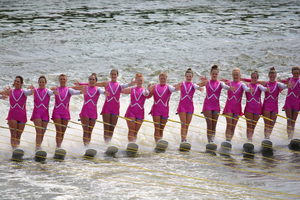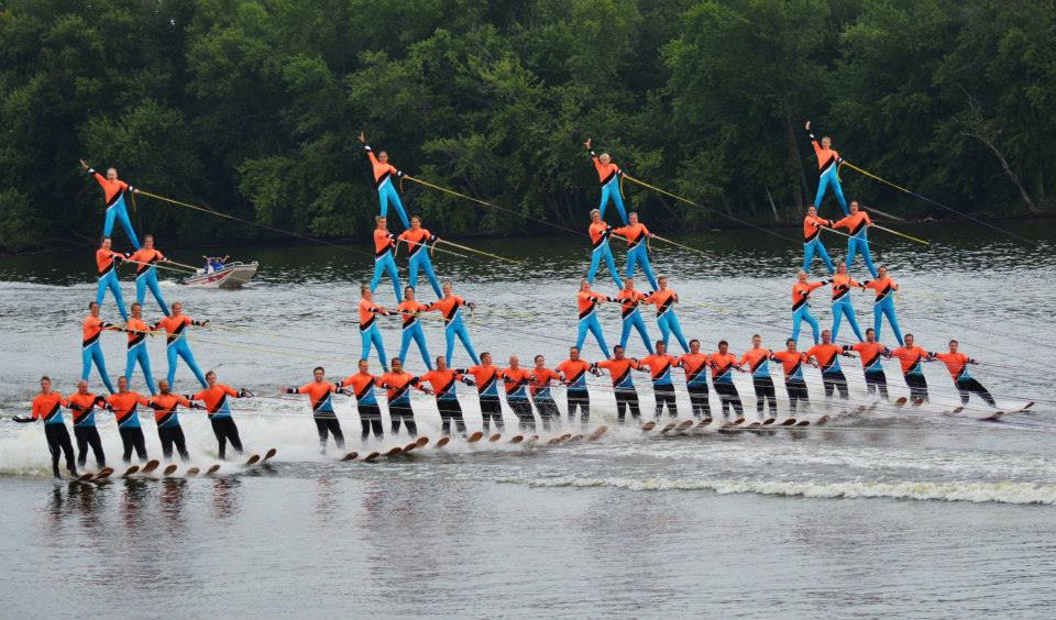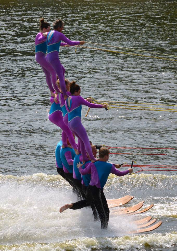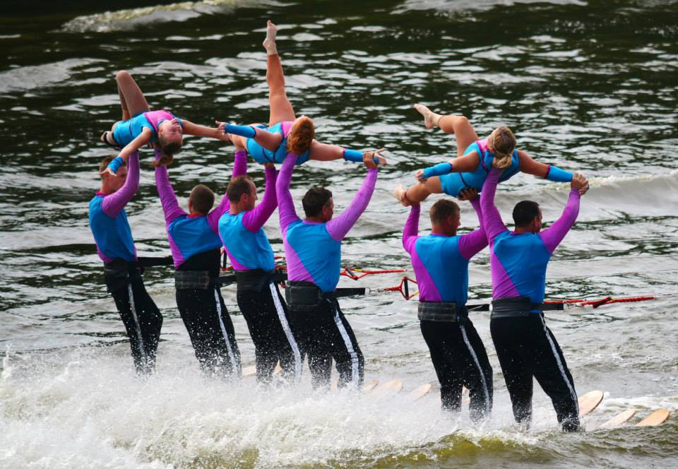 2014 boasted our most succesful season ever! Our team grew to over 160 members, the largest in history. We placed 3rd at the Mercury Open in June and, after flooding halted our practices and shows for two weeks, placed 2nd at the Central Regional tournament. We successfully built our largest pyramid ever with 47 people building four 4 tiers all behind one boat. We are only one of two teams to have ever built a pyramid that large, and we successfully climbed it up twice, and once also brought it all back down and into the beach, a feat that no other team in show skiing has ever done. We placed second place at the National Tournament in Janesville, Wisconsin, our best placement ever! We had more rides in our National show than any other team ever. We also won the award for highest scoring pyramid for our four 4 tier pyramid (of which we had 2 skiers fall). The theme was 'Choppy Water: My Life as a Water Ski Show Skier'. The show directors were Scott Allender and Tagen Tipton.