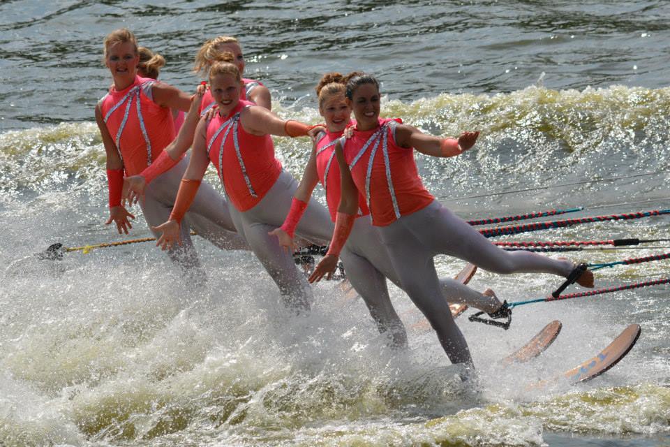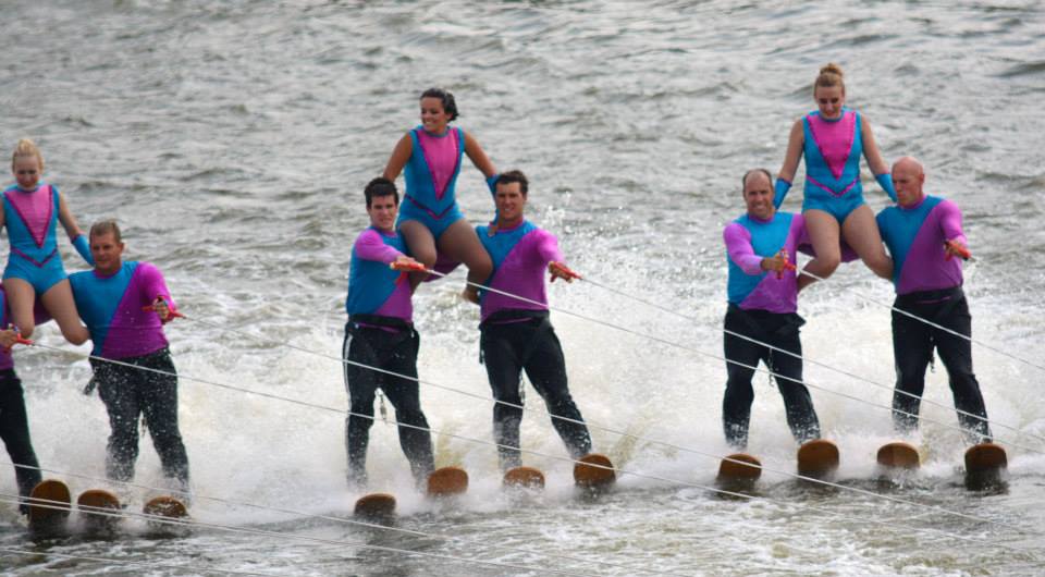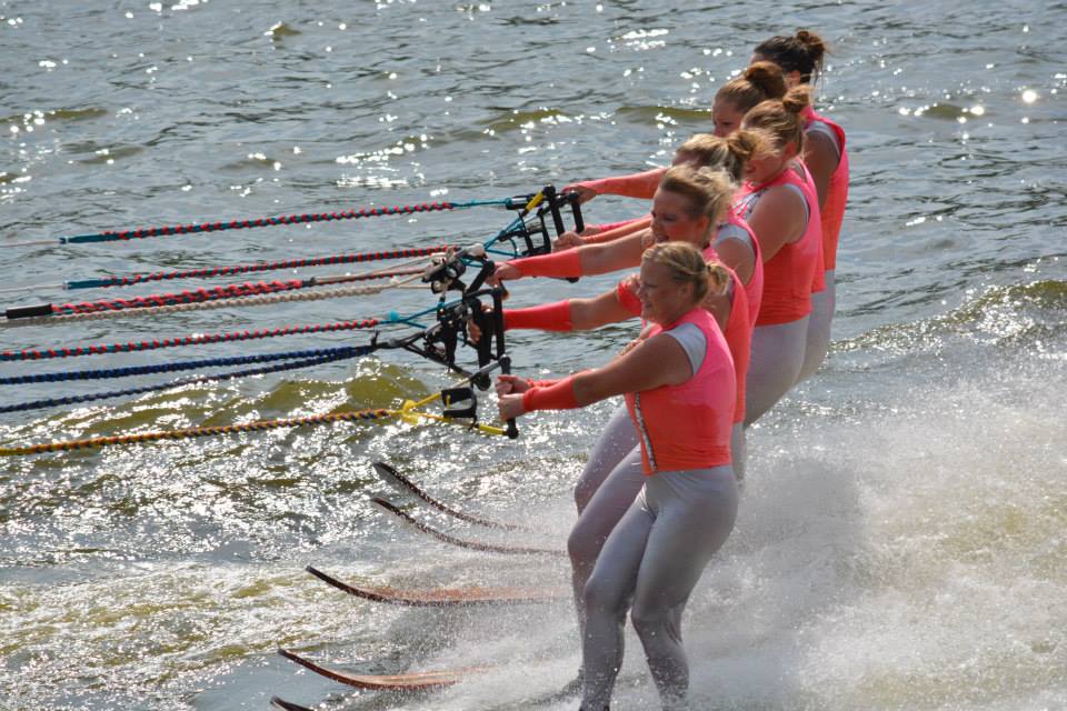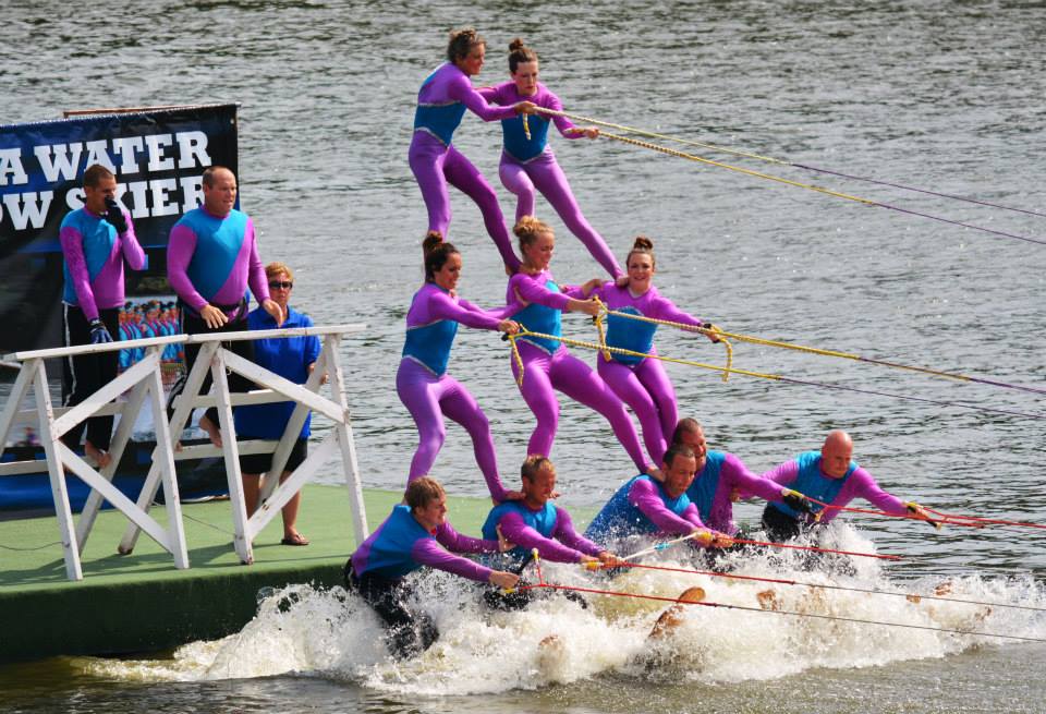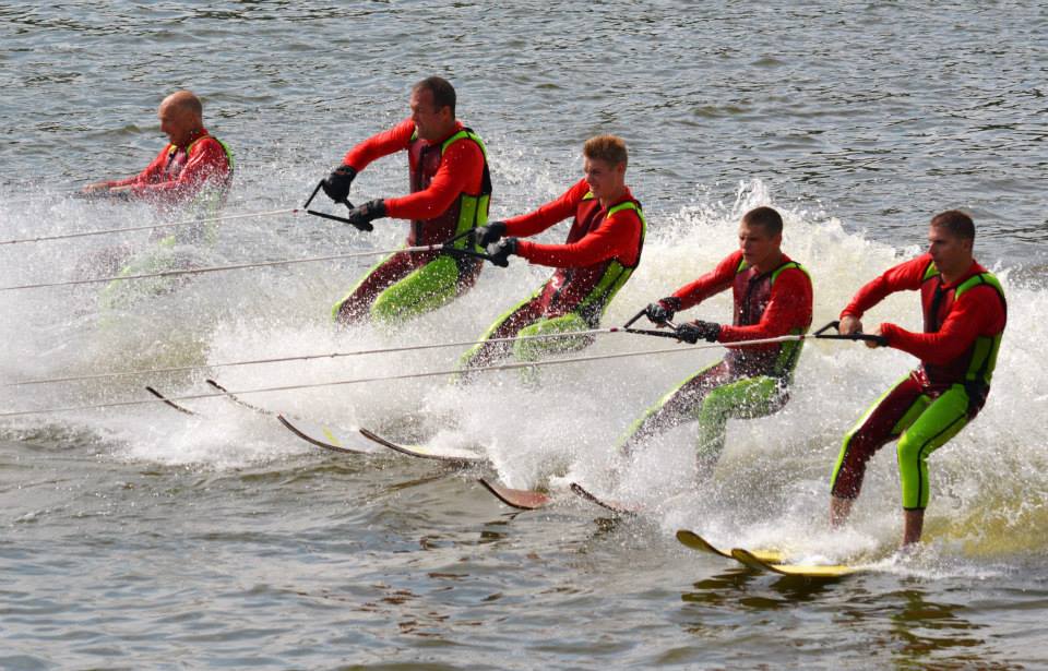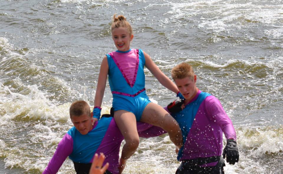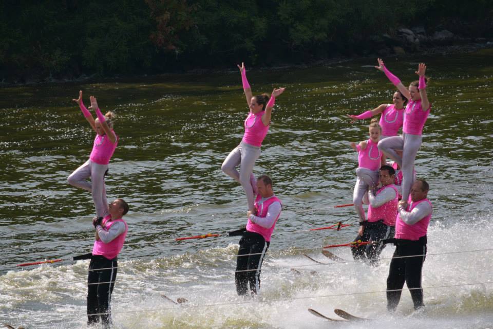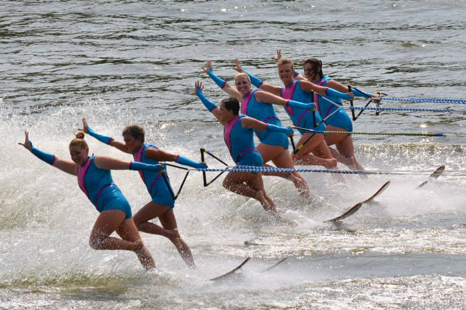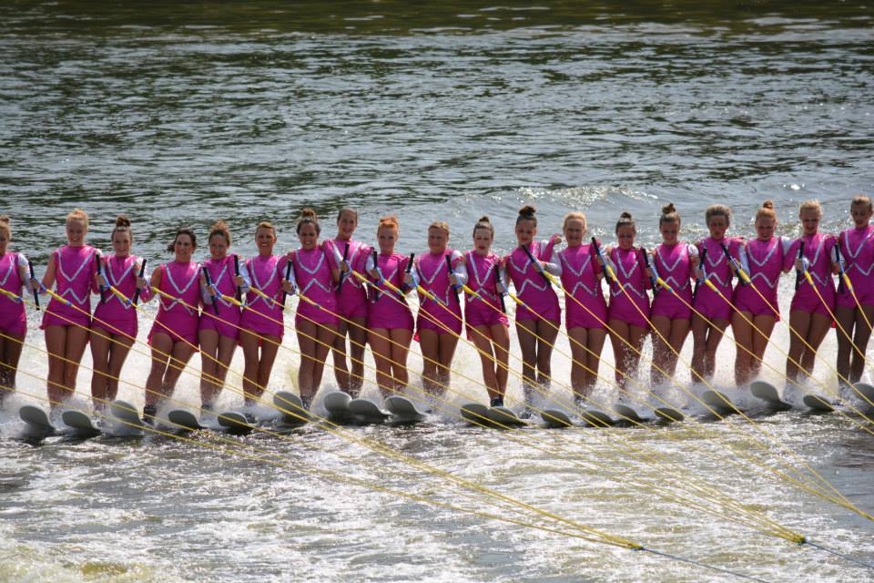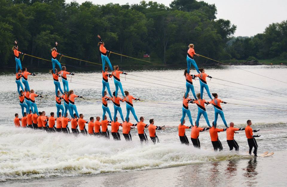 2014 boasted our most succesful season ever! Our team grew to over 160 members, the largest in history. We placed 3rd at the Mercury Open in June and, after flooding halted our practices and shows for two weeks, placed 2nd at the Central Regional tournament. We successfully built our largest pyramid ever with 47 people building four 4 tiers all behind one boat. We are only one of two teams to have ever built a pyramid that large, and we successfully climbed it up twice, and once also brought it all back down and into the beach, a feat that no other team in show skiing has ever done. We placed second place at the National Tournament in Janesville, Wisconsin, our best placement ever! We had more rides in our National show than any other team ever. We also won the award for highest scoring pyramid for our four 4 tier pyramid (of which we had 2 skiers fall). The theme was 'Choppy Water: My Life as a Water Ski Show Skier'. The show directors were Scott Allender and Tagen Tipton.