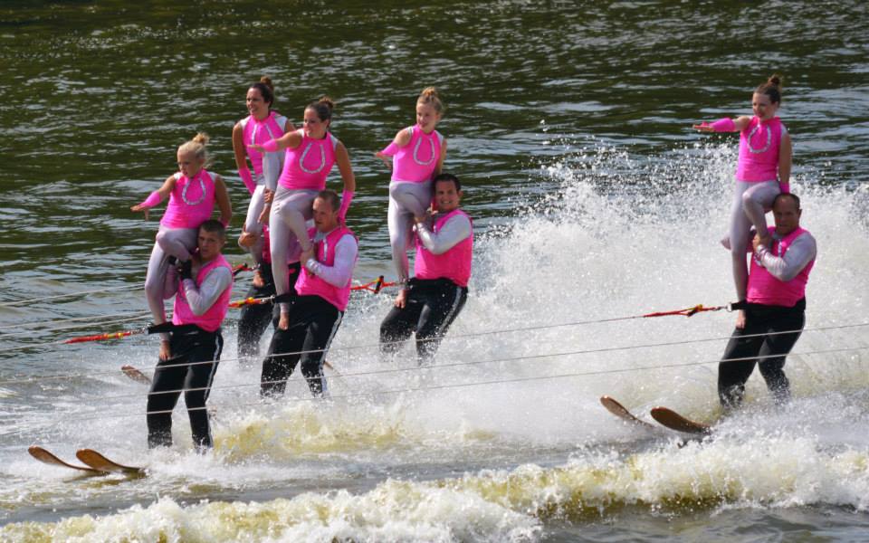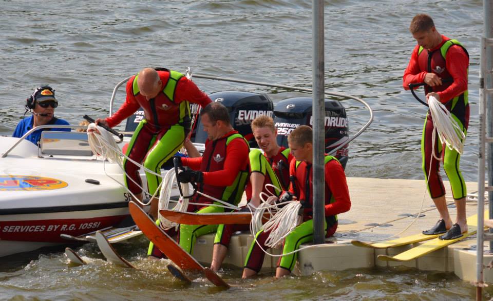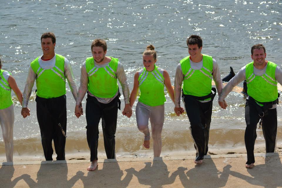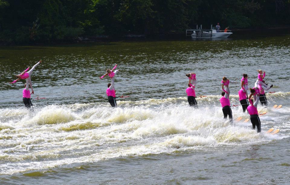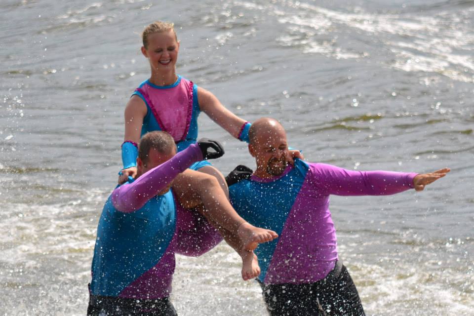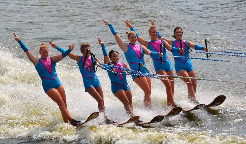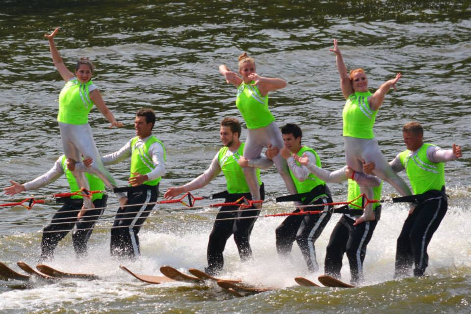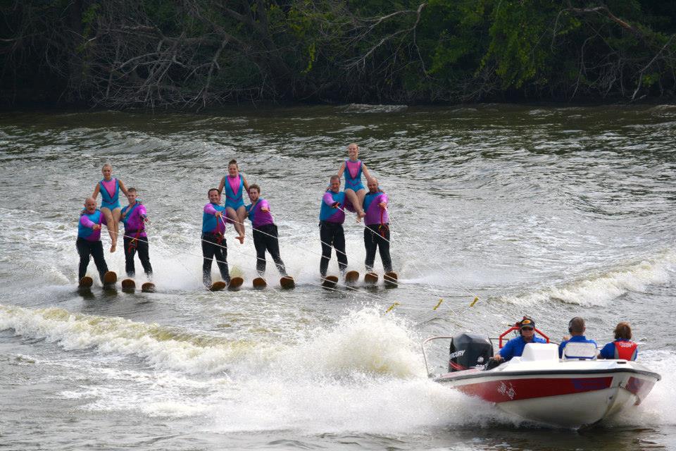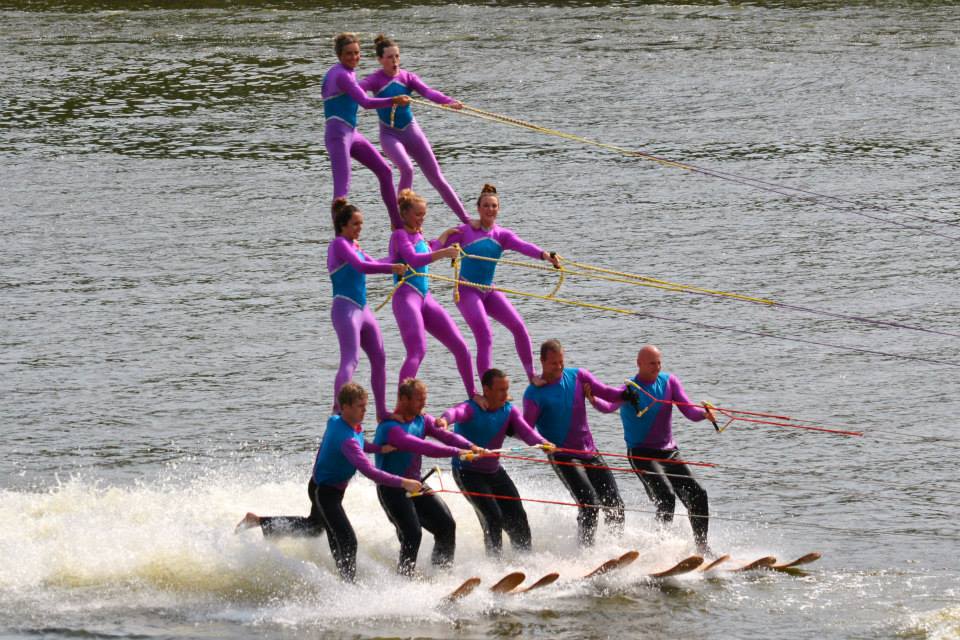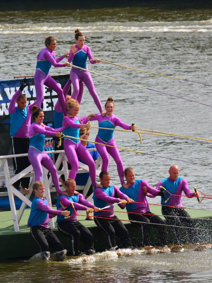 2014 boasted our most succesful season ever! Our team grew to over 160 members, the largest in history. We placed 3rd at the Mercury Open in June and, after flooding halted our practices and shows for two weeks, placed 2nd at the Central Regional tournament. We successfully built our largest pyramid ever with 47 people building four 4 tiers all behind one boat. We are only one of two teams to have ever built a pyramid that large, and we successfully climbed it up twice, and once also brought it all back down and into the beach, a feat that no other team in show skiing has ever done. We placed second place at the National Tournament in Janesville, Wisconsin, our best placement ever! We had more rides in our National show than any other team ever. We also won the award for highest scoring pyramid for our four 4 tier pyramid (of which we had 2 skiers fall). The theme was 'Choppy Water: My Life as a Water Ski Show Skier'. The show directors were Scott Allender and Tagen Tipton.