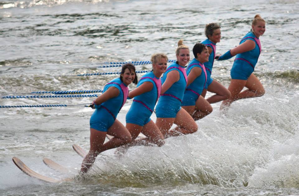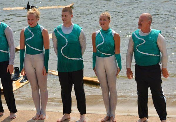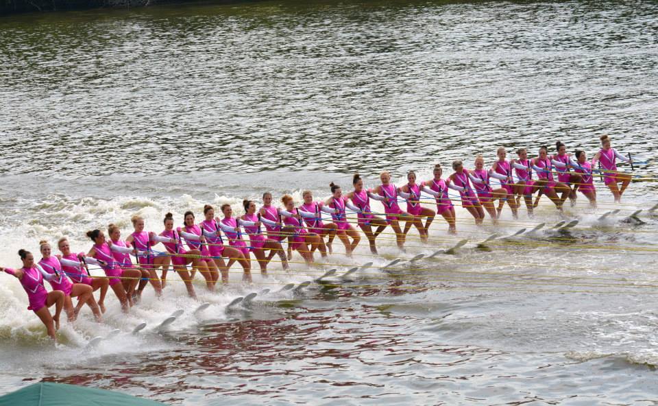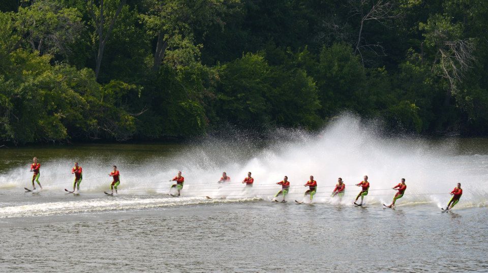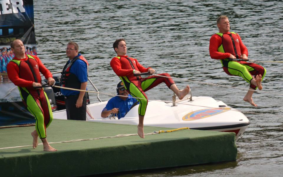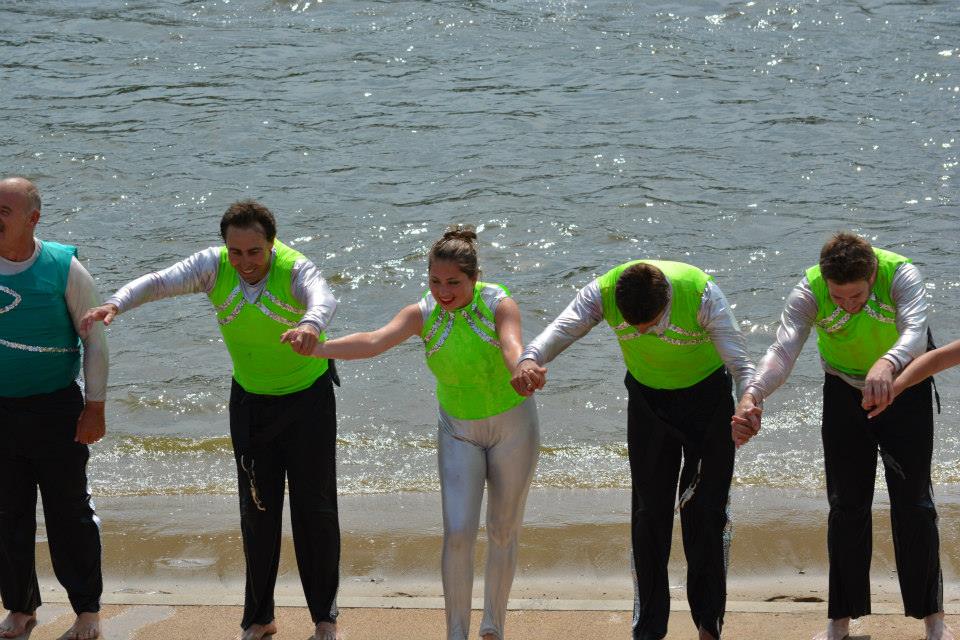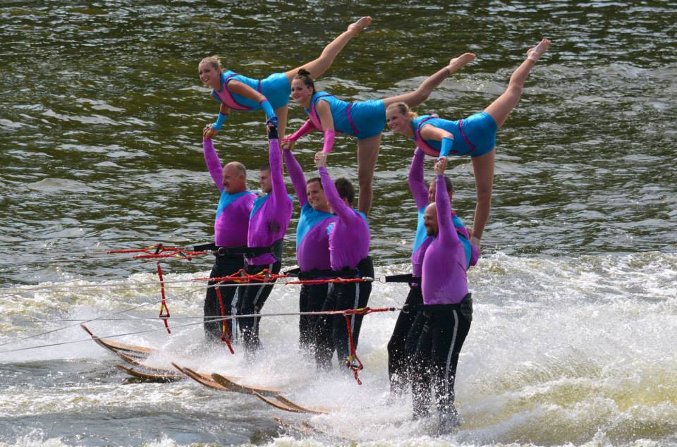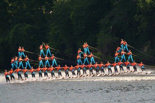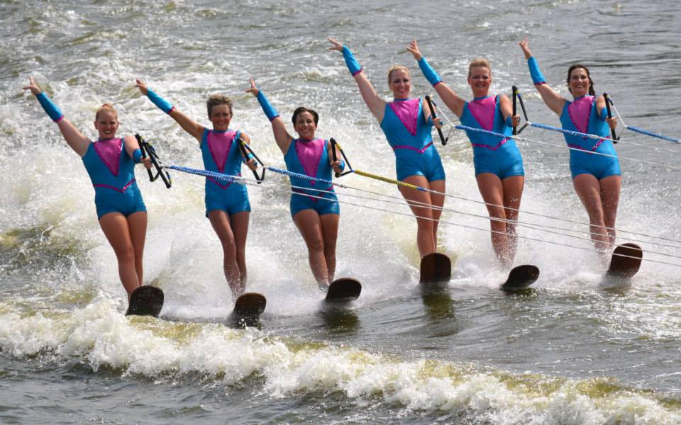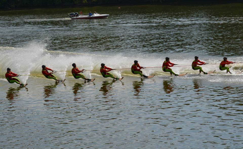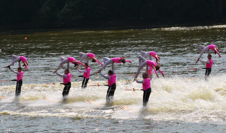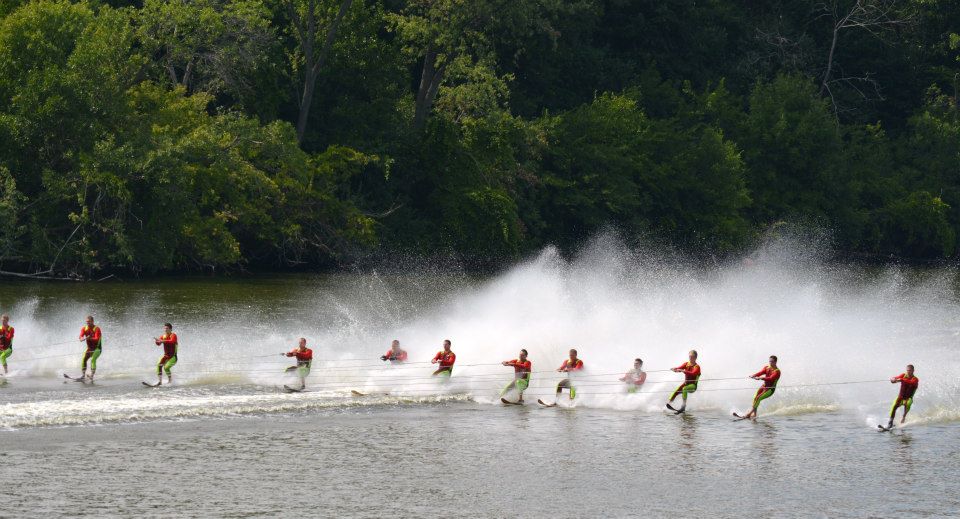 2014 boasted our most succesful season ever! Our team grew to over 160 members, the largest in history. We placed 3rd at the Mercury Open in June and, after flooding halted our practices and shows for two weeks, placed 2nd at the Central Regional tournament. We successfully built our largest pyramid ever with 47 people building four 4 tiers all behind one boat. We are only one of two teams to have ever built a pyramid that large, and we successfully climbed it up twice, and once also brought it all back down and into the beach, a feat that no other team in show skiing has ever done. We placed second place at the National Tournament in Janesville, Wisconsin, our best placement ever! We had more rides in our National show than any other team ever. We also won the award for highest scoring pyramid for our four 4 tier pyramid (of which we had 2 skiers fall). The theme was 'Choppy Water: My Life as a Water Ski Show Skier'. The show directors were Scott Allender and Tagen Tipton.