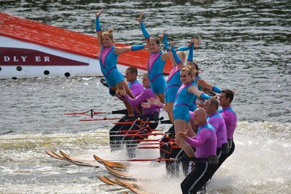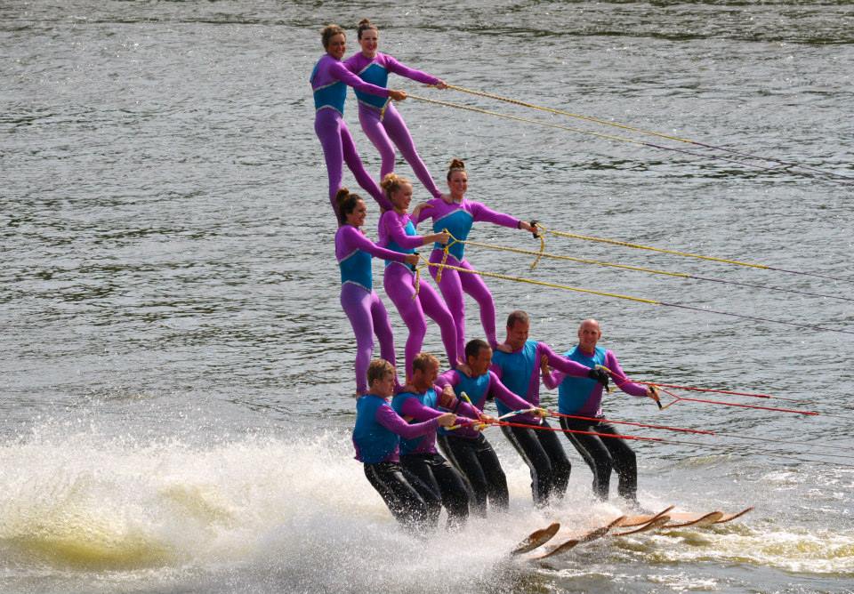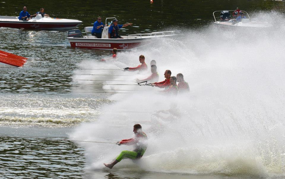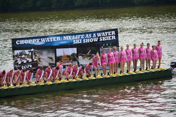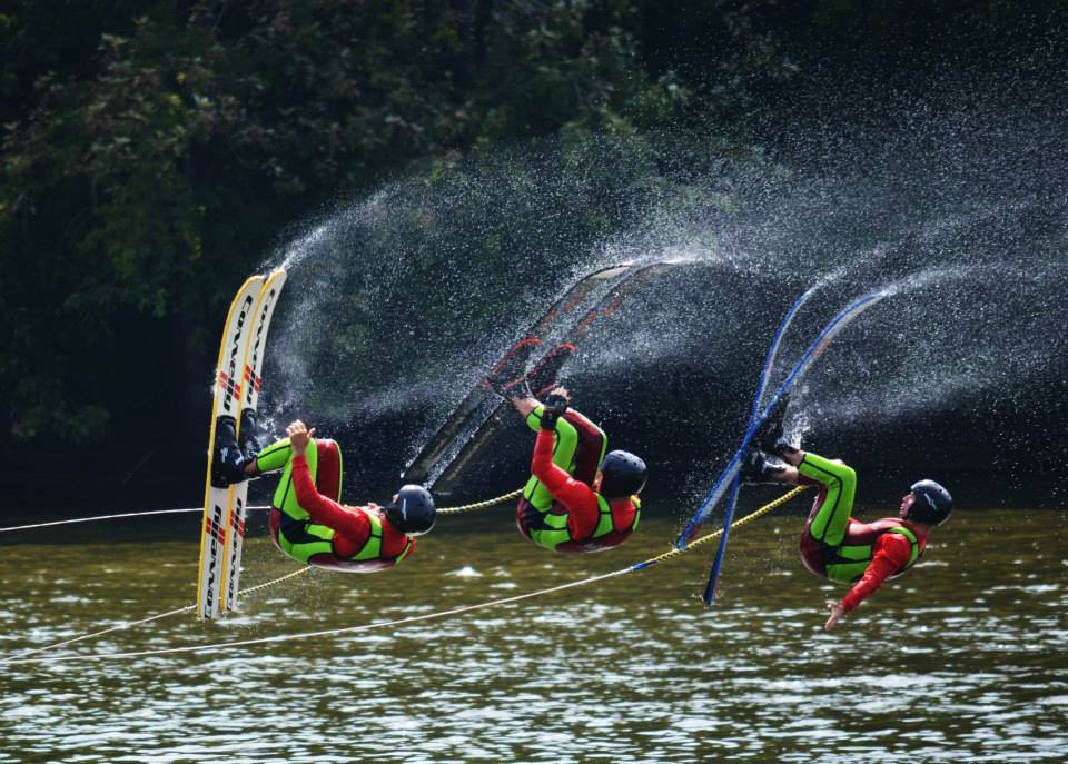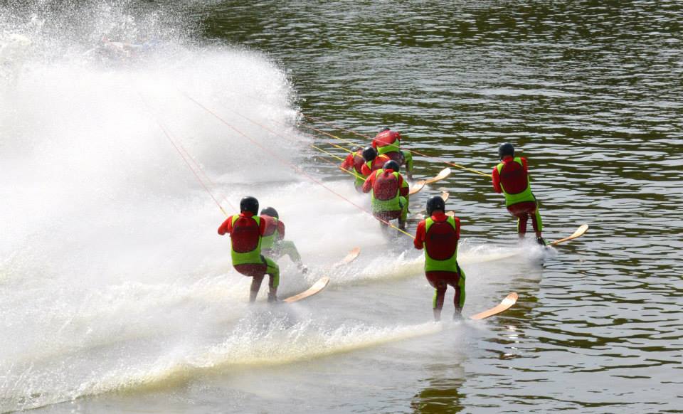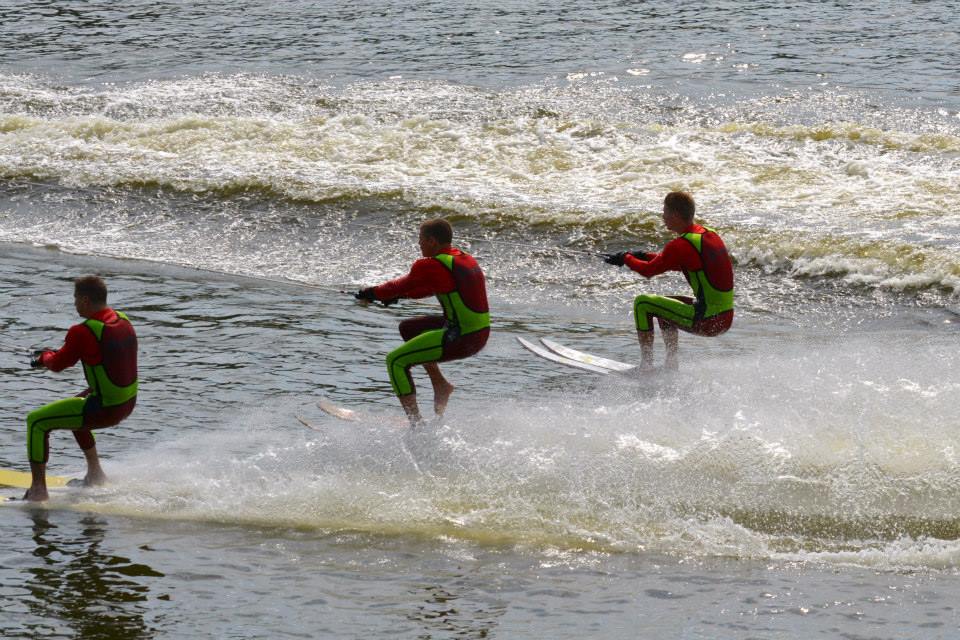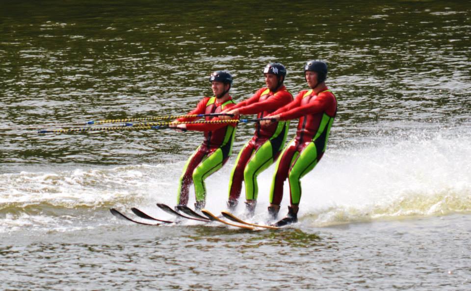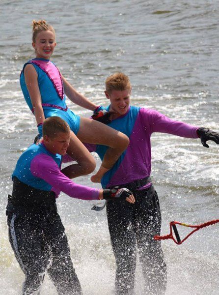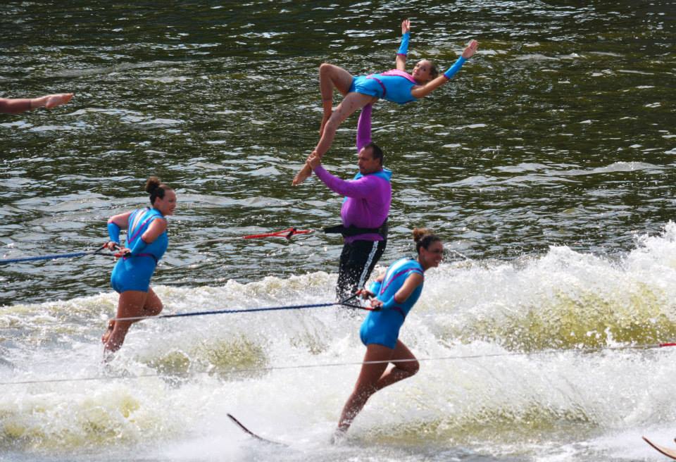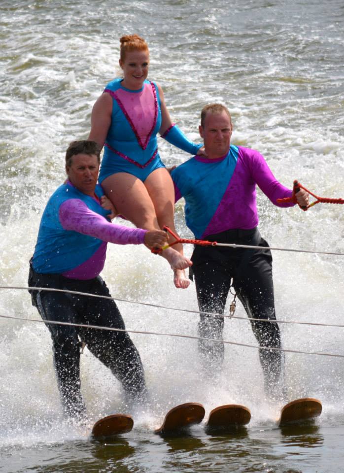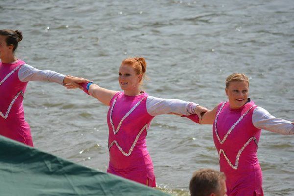2014 boasted our most succesful season ever! Our team grew to over 160 members, the largest in history. We placed 3rd at the Mercury Open in June and, after flooding halted our practices and shows for two weeks, placed 2nd at the Central Regional tournament. We successfully built our largest pyramid ever with 47 people building four 4 tiers all behind one boat. We are only one of two teams to have ever built a pyramid that large, and we successfully climbed it up twice, and once also brought it all back down and into the beach, a feat that no other team in show skiing has ever done. We placed second place at the National Tournament in Janesville, Wisconsin, our best placement ever! We had more rides in our National show than any other team ever. We also won the award for highest scoring pyramid for our four 4 tier pyramid (of which we had 2 skiers fall). The theme was 'Choppy Water: My Life as a Water Ski Show Skier'. The show directors were Scott Allender and Tagen Tipton.
