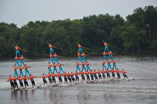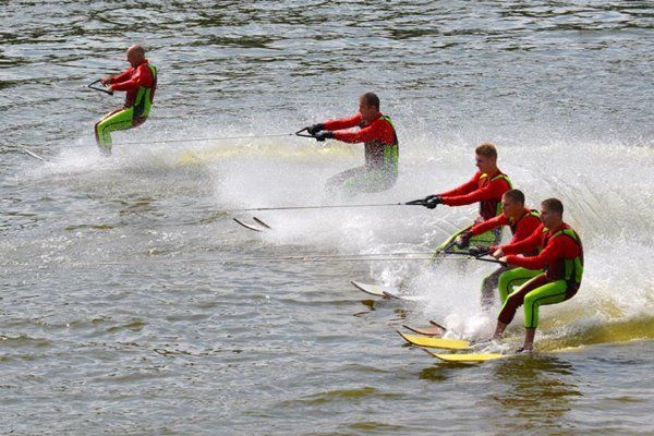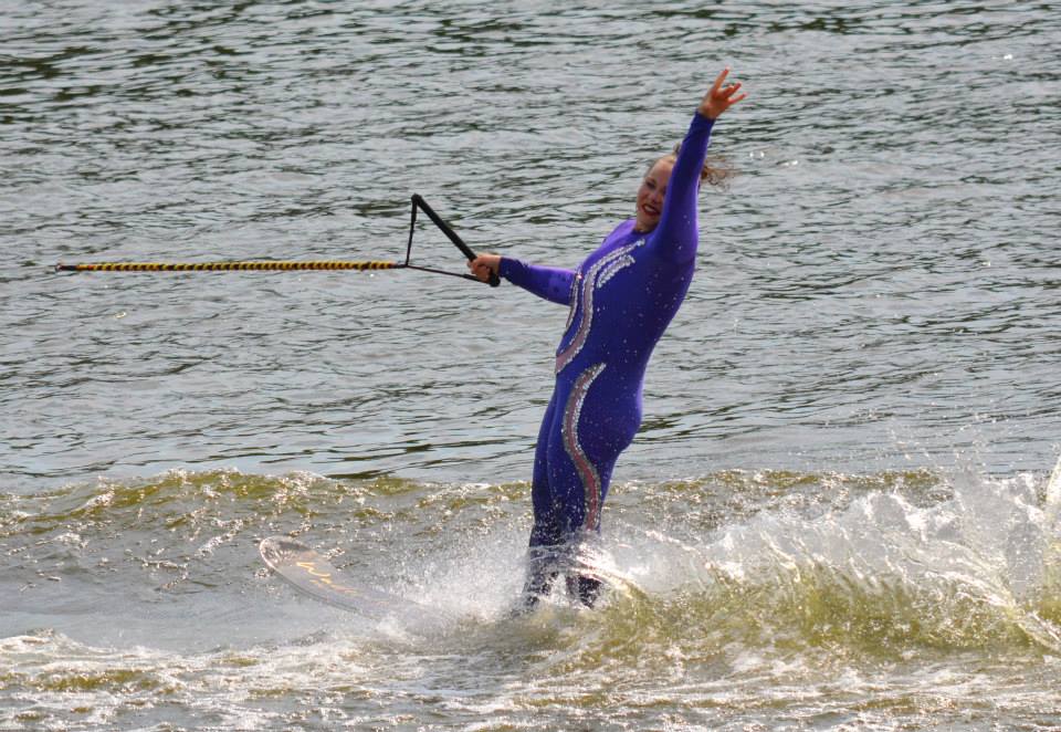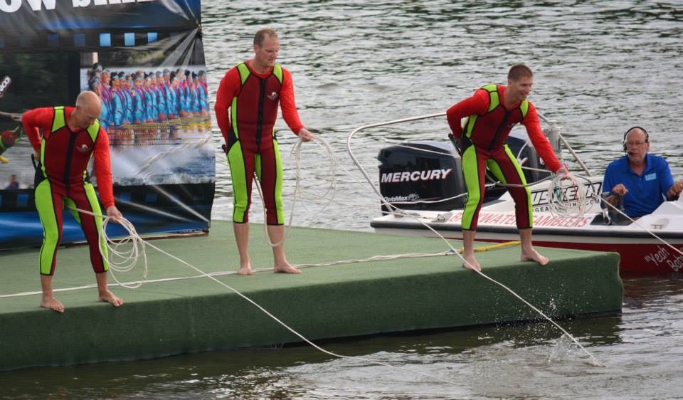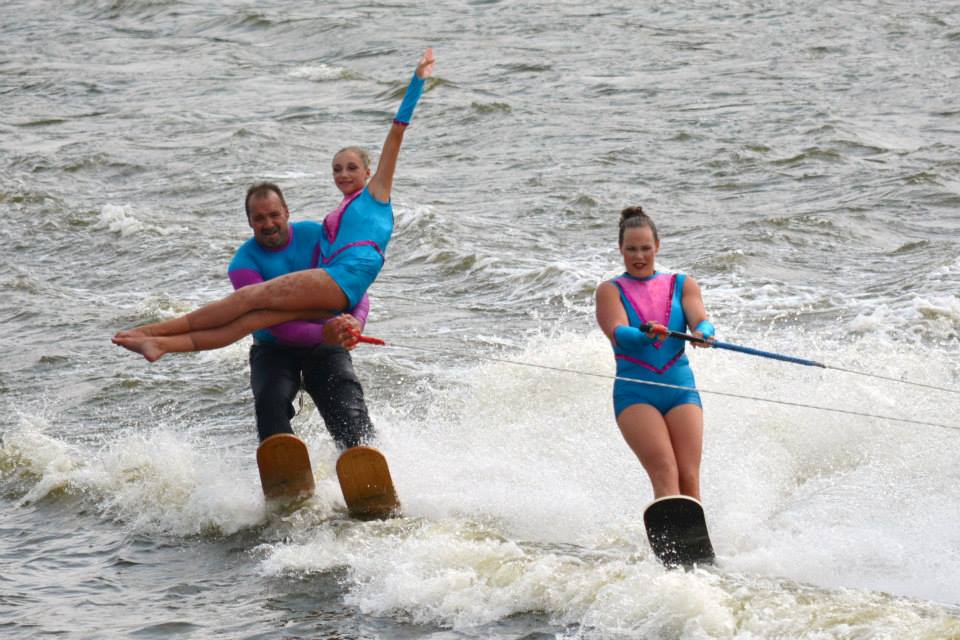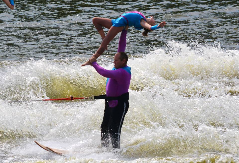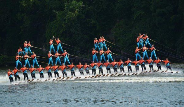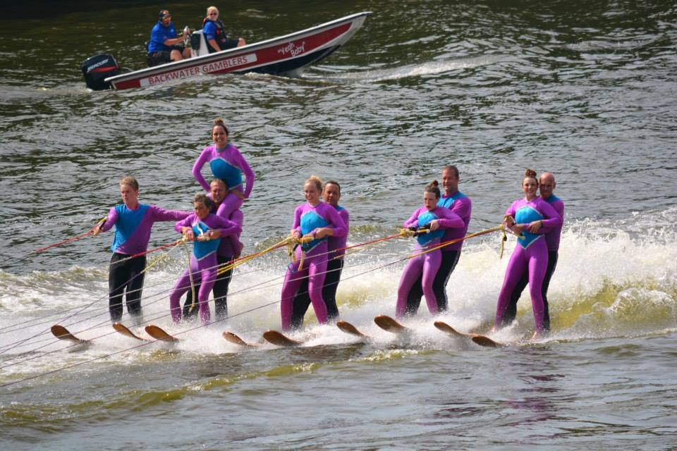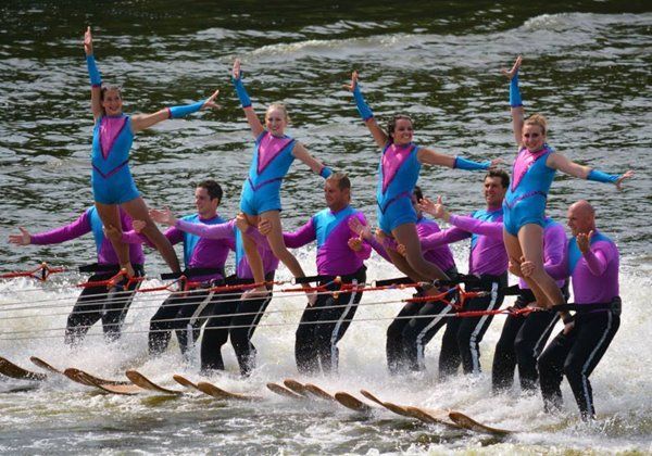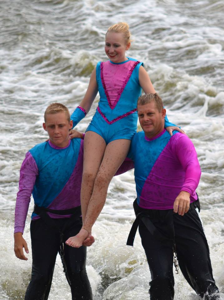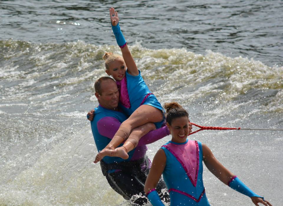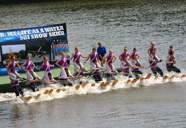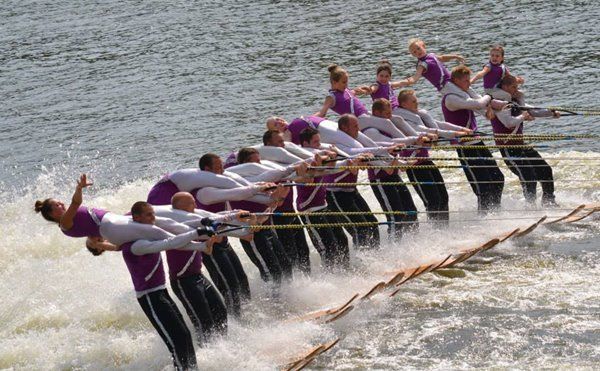 2014 boasted our most succesful season ever! Our team grew to over 160 members, the largest in history. We placed 3rd at the Mercury Open in June and, after flooding halted our practices and shows for two weeks, placed 2nd at the Central Regional tournament. We successfully built our largest pyramid ever with 47 people building four 4 tiers all behind one boat. We are only one of two teams to have ever built a pyramid that large, and we successfully climbed it up twice, and once also brought it all back down and into the beach, a feat that no other team in show skiing has ever done. We placed second place at the National Tournament in Janesville, Wisconsin, our best placement ever! We had more rides in our National show than any other team ever. We also won the award for highest scoring pyramid for our four 4 tier pyramid (of which we had 2 skiers fall). The theme was 'Choppy Water: My Life as a Water Ski Show Skier'. The show directors were Scott Allender and Tagen Tipton.
