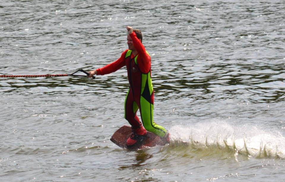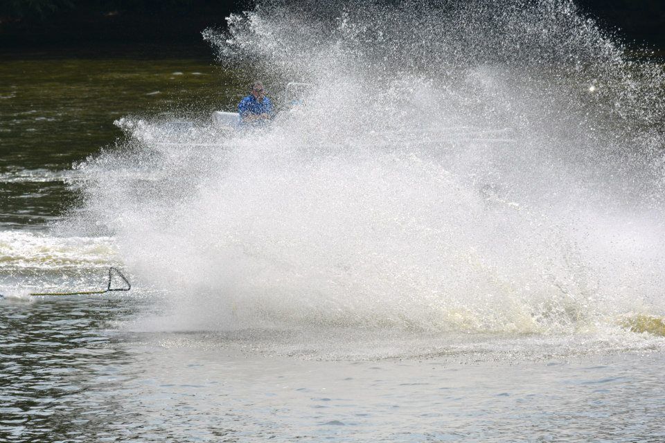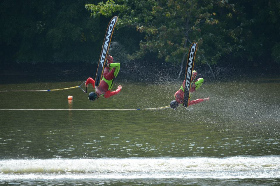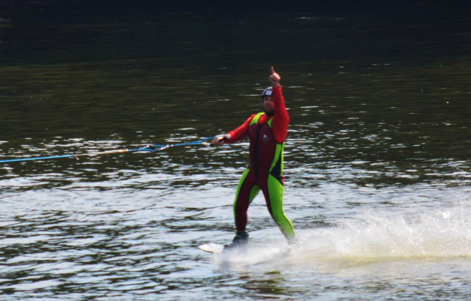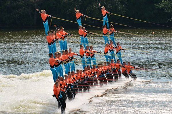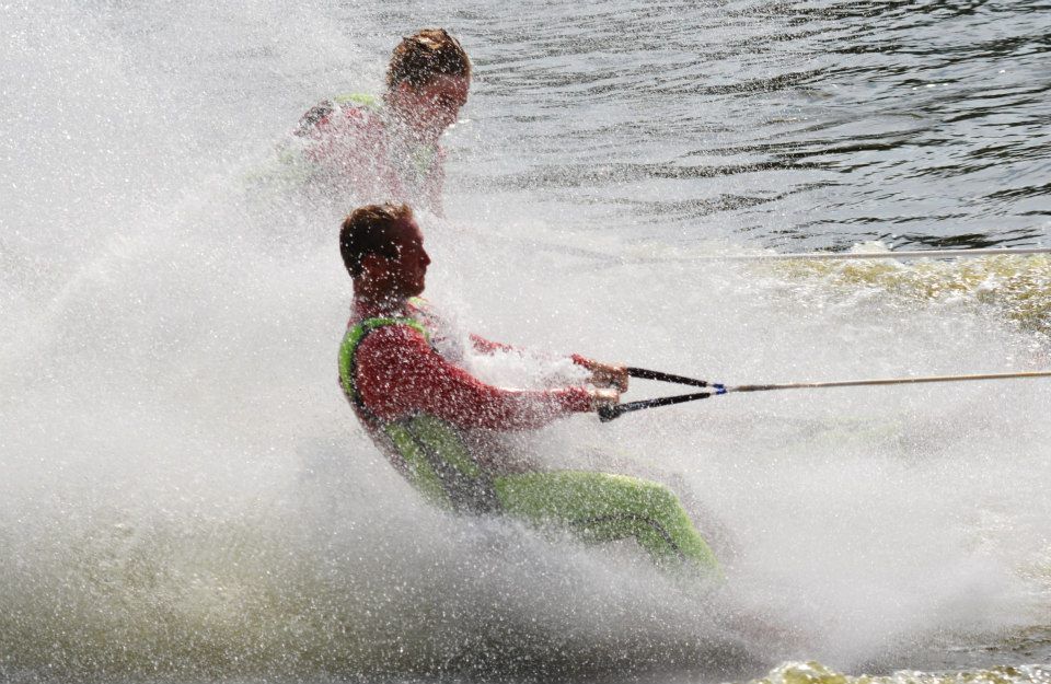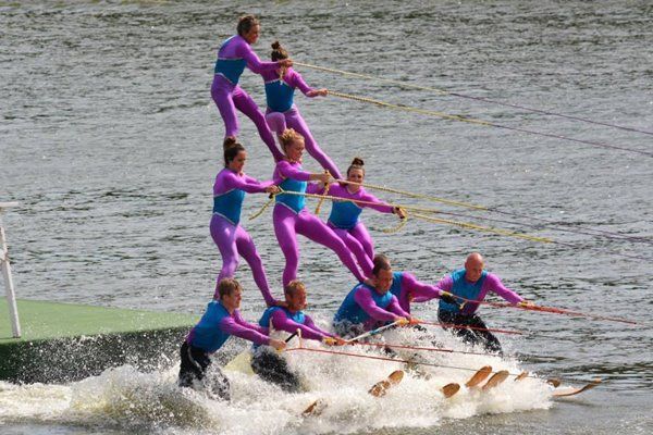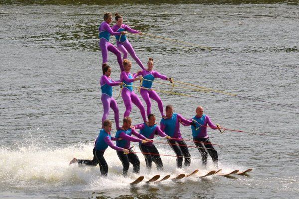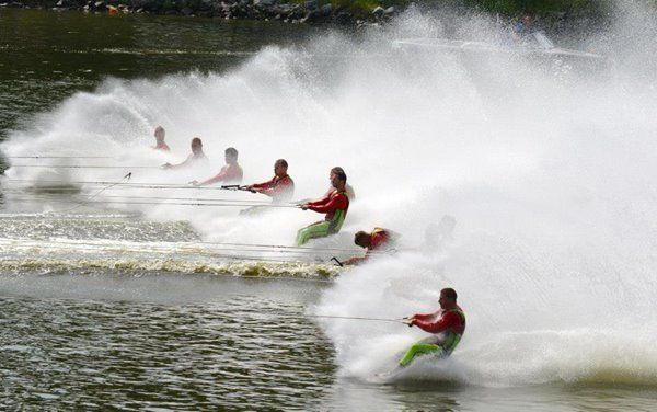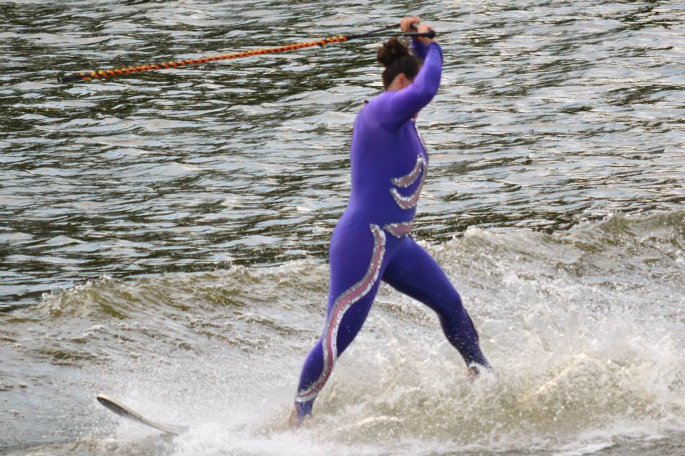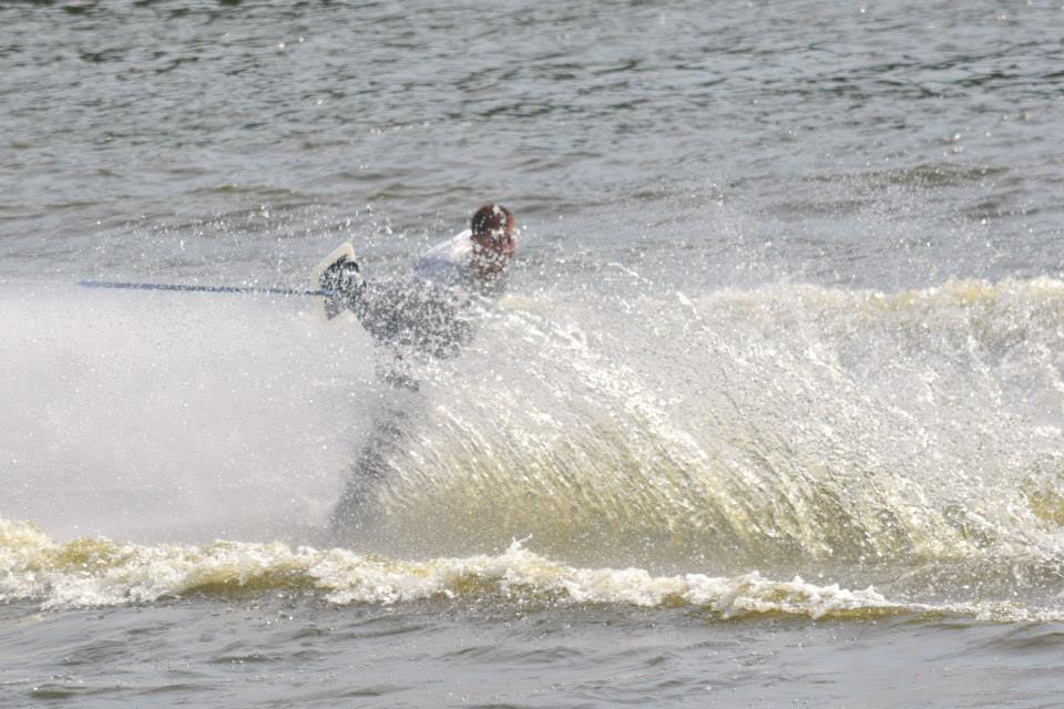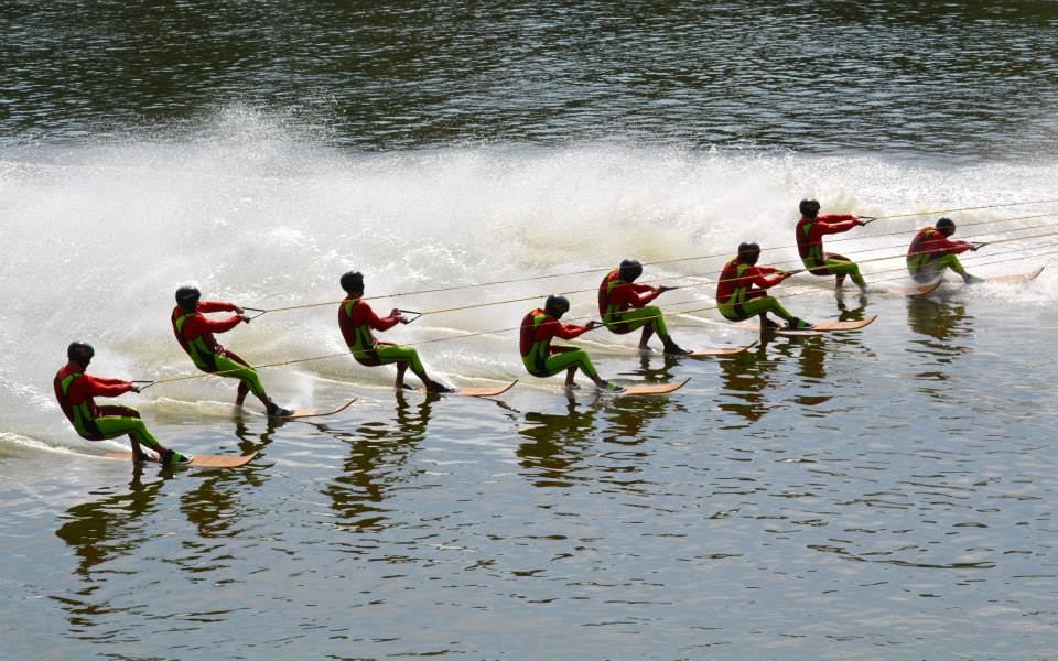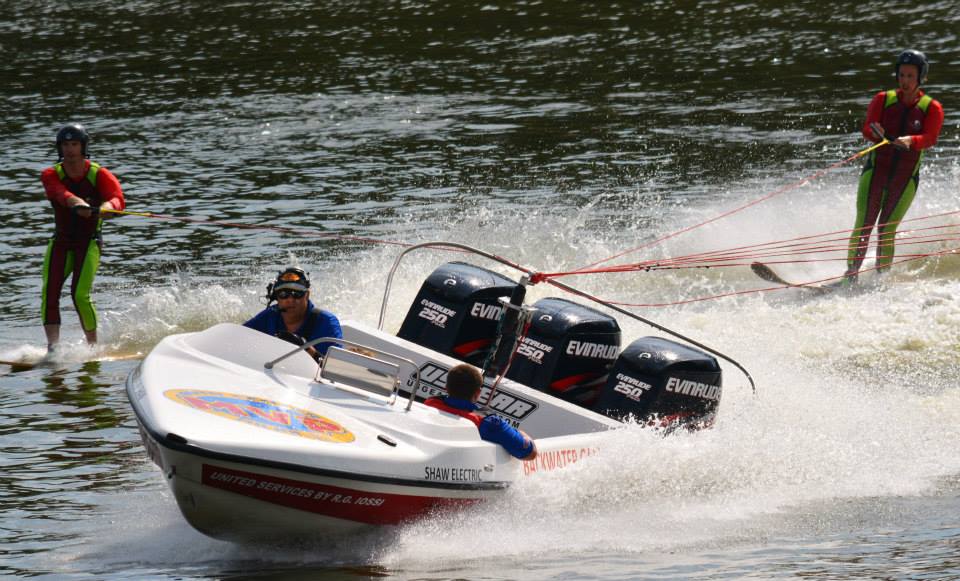 2014 boasted our most succesful season ever! Our team grew to over 160 members, the largest in history. We placed 3rd at the Mercury Open in June and, after flooding halted our practices and shows for two weeks, placed 2nd at the Central Regional tournament. We successfully built our largest pyramid ever with 47 people building four 4 tiers all behind one boat. We are only one of two teams to have ever built a pyramid that large, and we successfully climbed it up twice, and once also brought it all back down and into the beach, a feat that no other team in show skiing has ever done. We placed second place at the National Tournament in Janesville, Wisconsin, our best placement ever! We had more rides in our National show than any other team ever. We also won the award for highest scoring pyramid for our four 4 tier pyramid (of which we had 2 skiers fall). The theme was 'Choppy Water: My Life as a Water Ski Show Skier'. The show directors were Scott Allender and Tagen Tipton.
